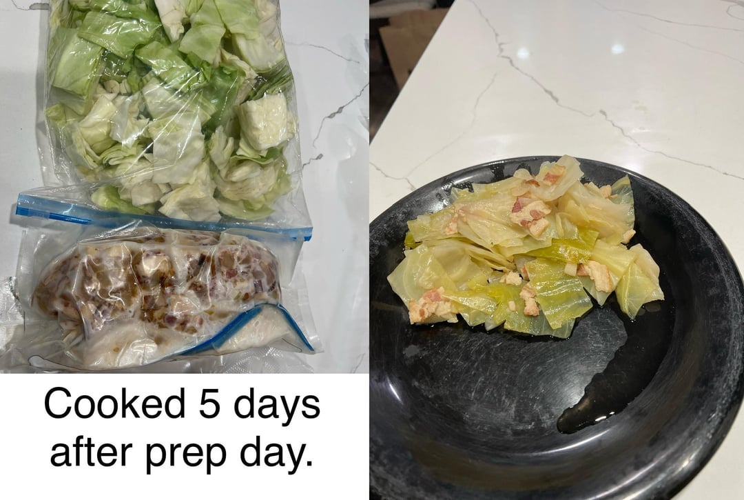 1: cabbage. Prep: Cooked bacon and onions for cabbage. Washed and cut cabbage.