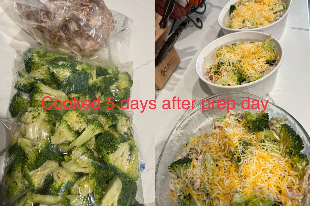 2: Broccoli and chicken dish. Prep: Pulled from bone and shredded cooked chicken and cooked bacon and onions.