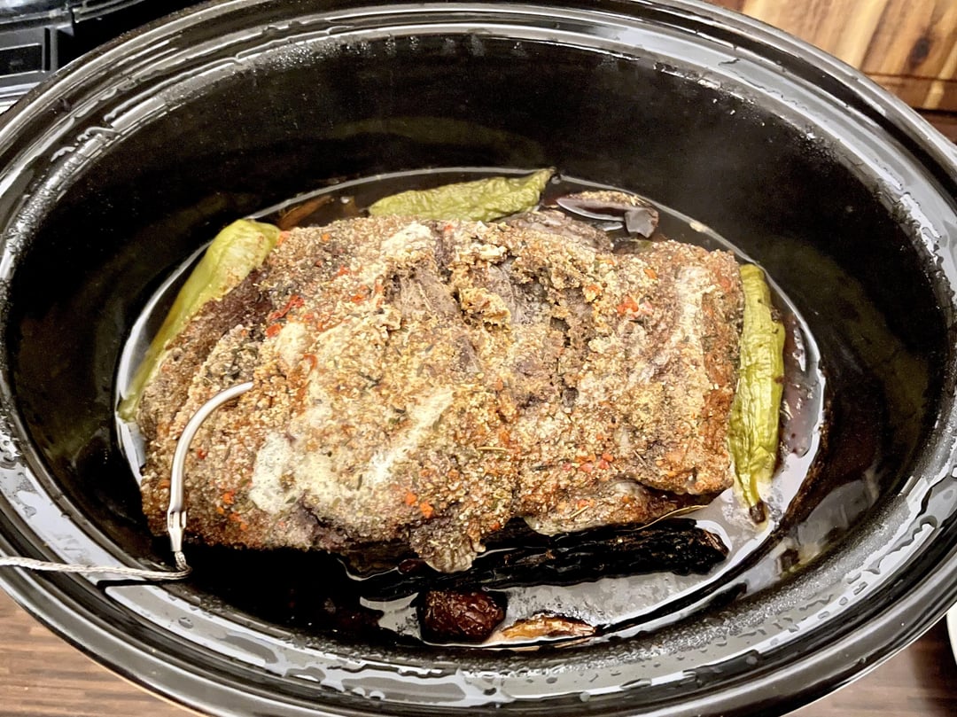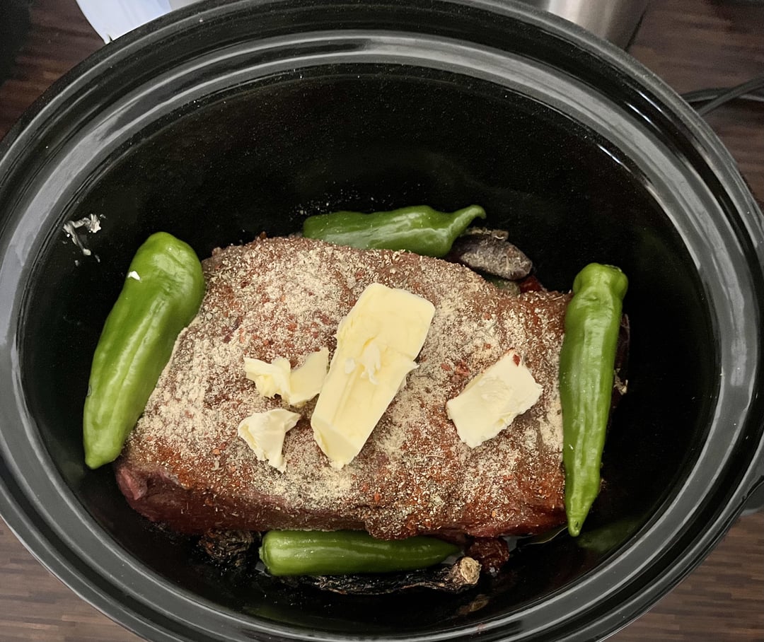 Wash the meat (2.8 kg beef neck) and the green peppers, peel two onions, cut into eighths and put everything together in the slow cooker. Season with salt, pepper, garlic powder, cumin, cinnamon, thyme, smoked paprika, chilli powder, allspice, bay leaf, cloves and marjoram (Quantities were Freestyle). Then add a dried ancho chilli, 2 chipotle chilli, 5 habanero chillies and 125 grams of butter. Fill everything up with about 200-250ml beef broth. Cook on low for 8 hours. At the end of the cooking time, remove the meat and chop it up. Mix the cillis, onions and peppers in the blender and mix partly with the meat.