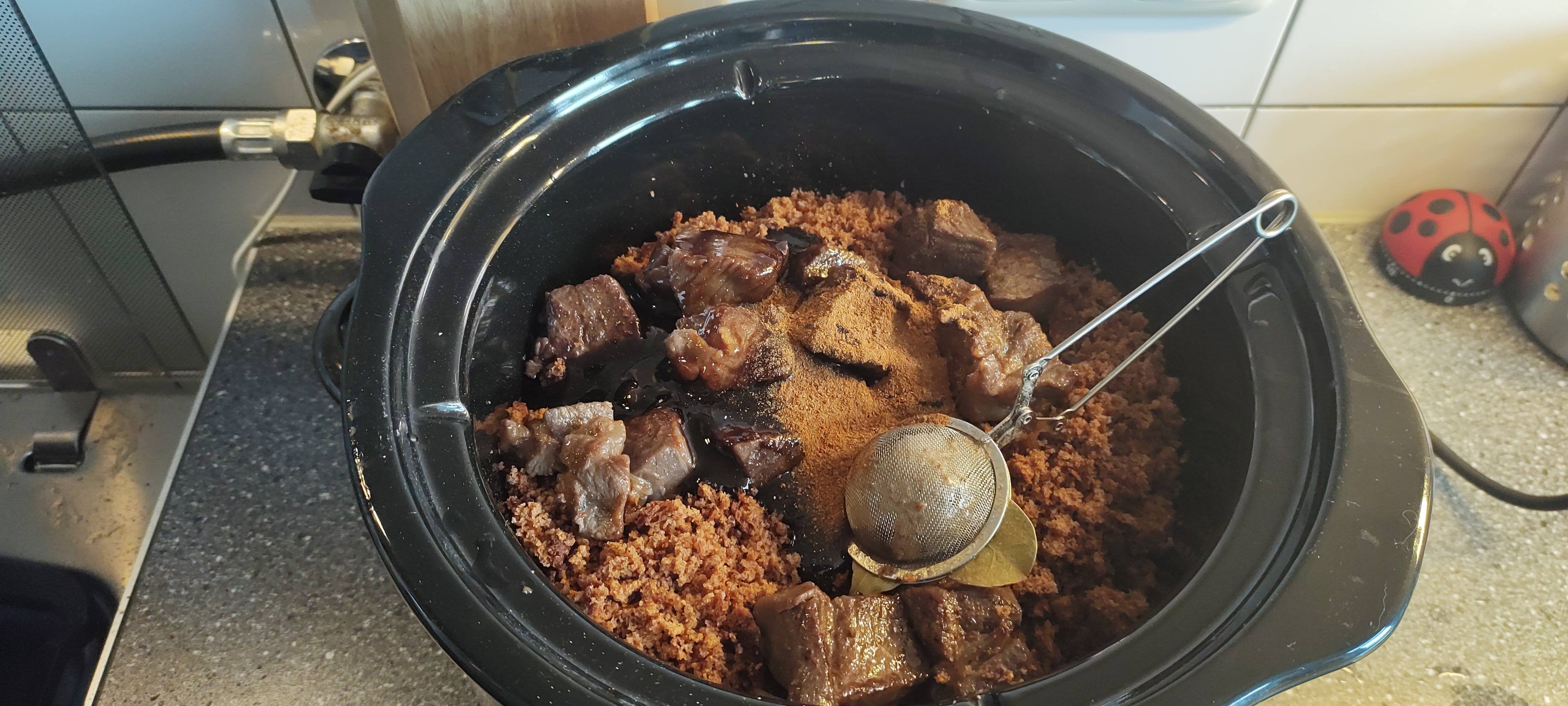 You can’t see all the onions, and there’s cloves and juniper hidden in the tea strainer as well.
