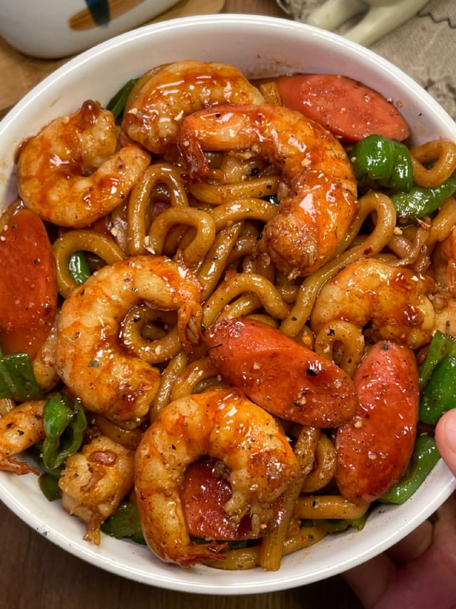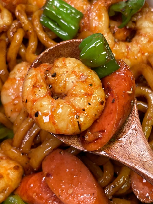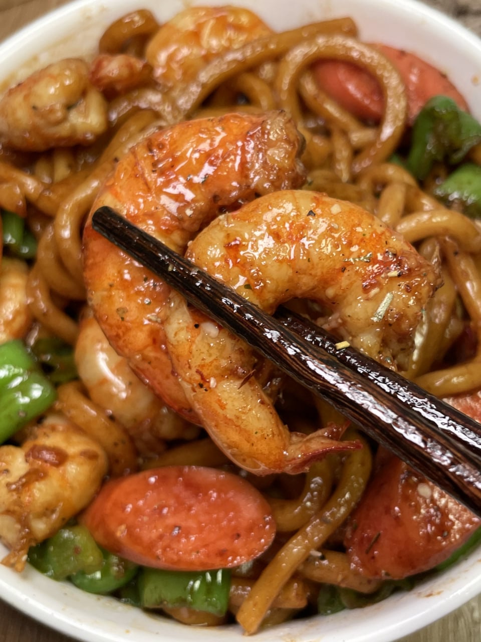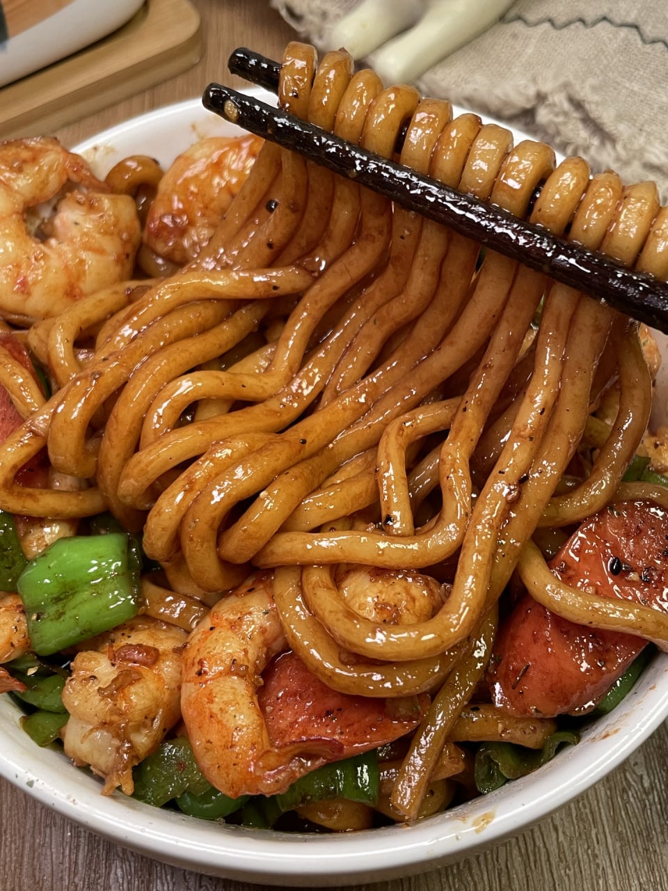 Ingredients: shrimp, ham, green pepper, udon noodles