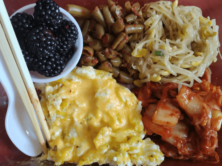 my breakfast the other day, leftover banchan, cheesy eggs, blackberries, and kimchi:by Background_Koala_455 1 Comment kwang_ja 3 years ago Hi! What’s between the bean sprouts and blackberries?Write A CommentYou must be logged in to post a comment.