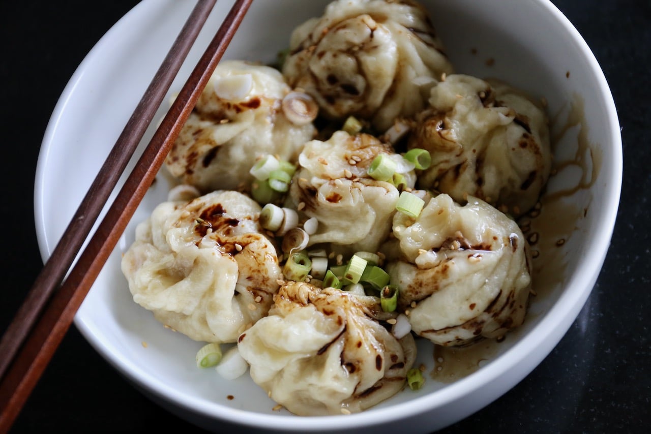 **Frying** 10. Heat the oil in a nonstick frying pan over a high heat. Place the buns into the pan. Once the bottom of the buns turn golden brown, pour the water into the pan and cover with a lid so they can steam, 8-10 minutes on medium low heat. 11. Uncover the pan when the water evaporates completely. Cook for another 30 seconds until they get crispy. 12. Transfer pork buns to a plate and sprinkle with sesame seeds and scallions. 13. Serve hot with soy sauce, chili oil or shallot oil.