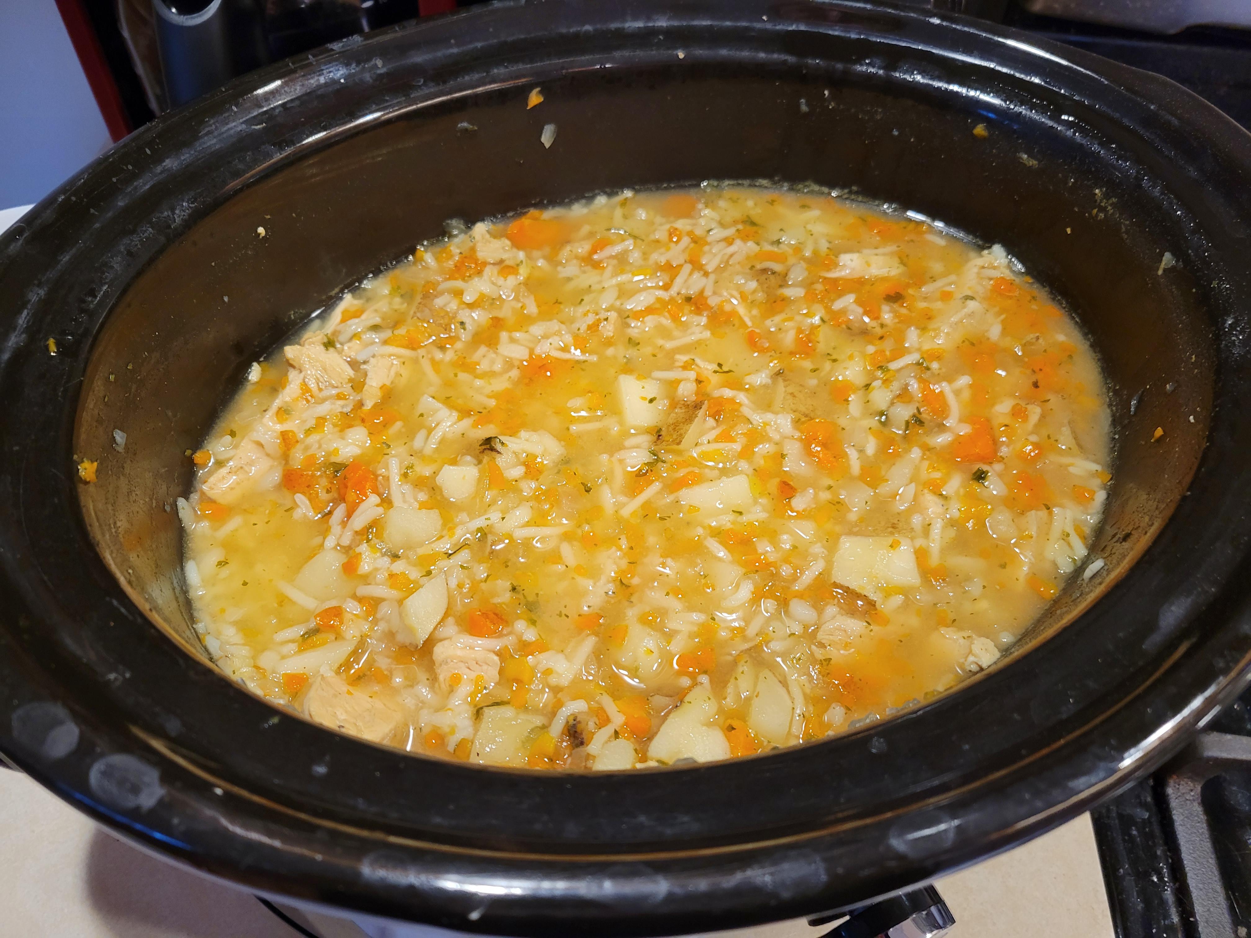 i first blended the carrot and onion into small pieces and diced potatoes then andded everything but the rice a roni and waited until the veggies felt soft then added the rice a roni at the end and it took a couple minute for that to cook. you can use any flavor rice a roni i used 2 diffrent kinds. also any potatoes type you like.