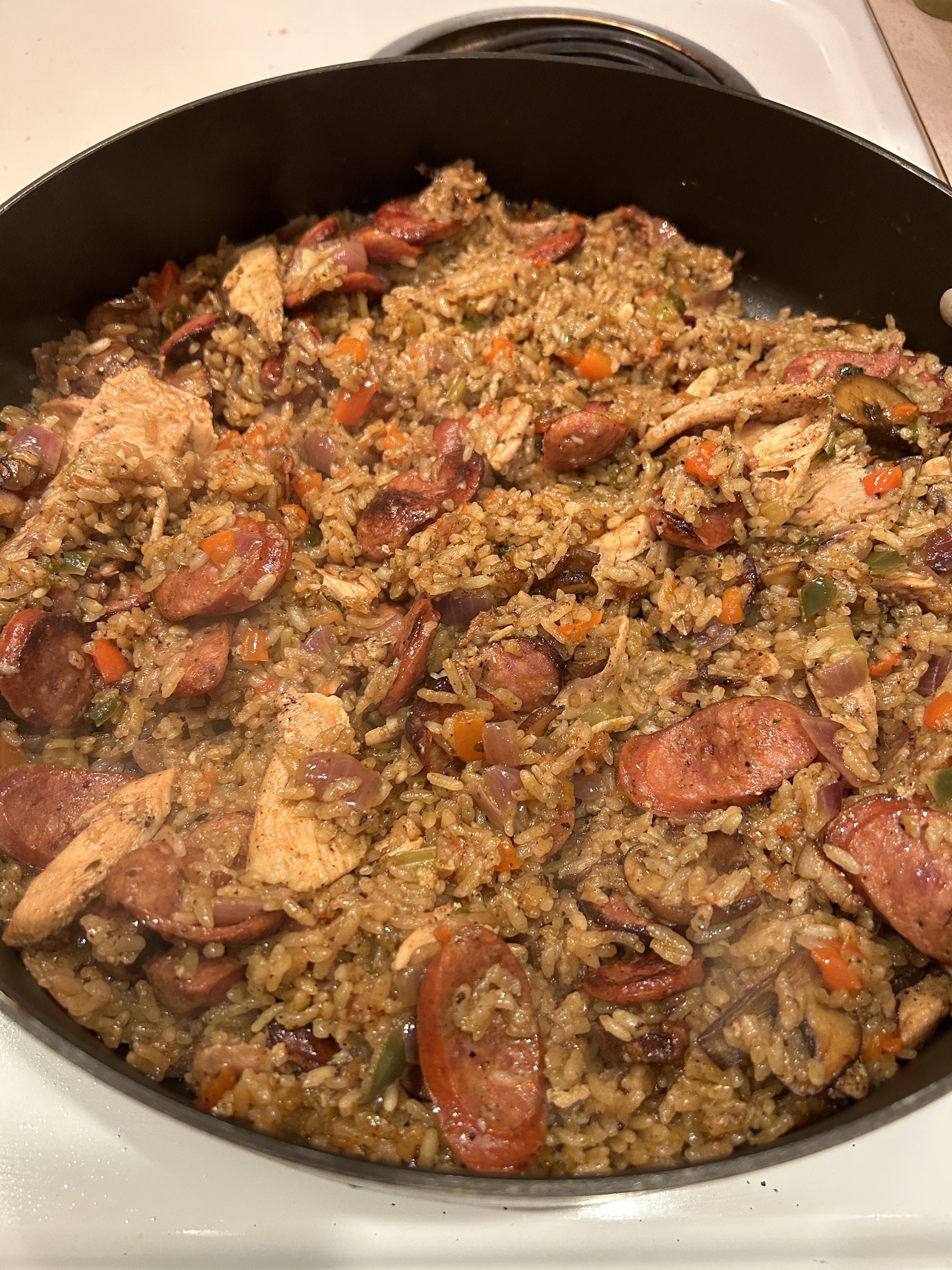1. Add two portions of rice to rice cooker. Fill with chicken stock to just under appropriate line. Don’t start rice cooker yet. 2. Brown ingredients in stages. First anduille sausage, then chicken, then your Trinity (onions, bell pepper, celery, jalapeno and garlic), finally mushrooms. As each finishes, transfer into rice cooker. 3. Add spices, salt and pepper, and hot sauce to rice cooker. 4. Run rice cooker. If it has a “harder” setting, use that. 5. When rice is done, fry in large pan or wok like fried rice. You won’t need any additional oil.