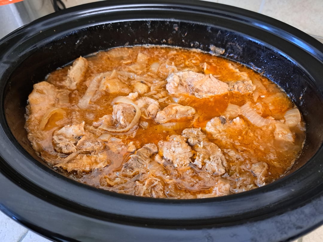 You could just throw everything in there, but this time I seared the meat in advance. I do also recommend caramelizing the onions lightly before you put them in. If you want more apple flavor, you could easily replace one of the onions with another apple. I also cut up the roast for the last hour, which isn’t required. I think its worth it to add the sauerkraut, but can definitely be removed to add more onion/apple.