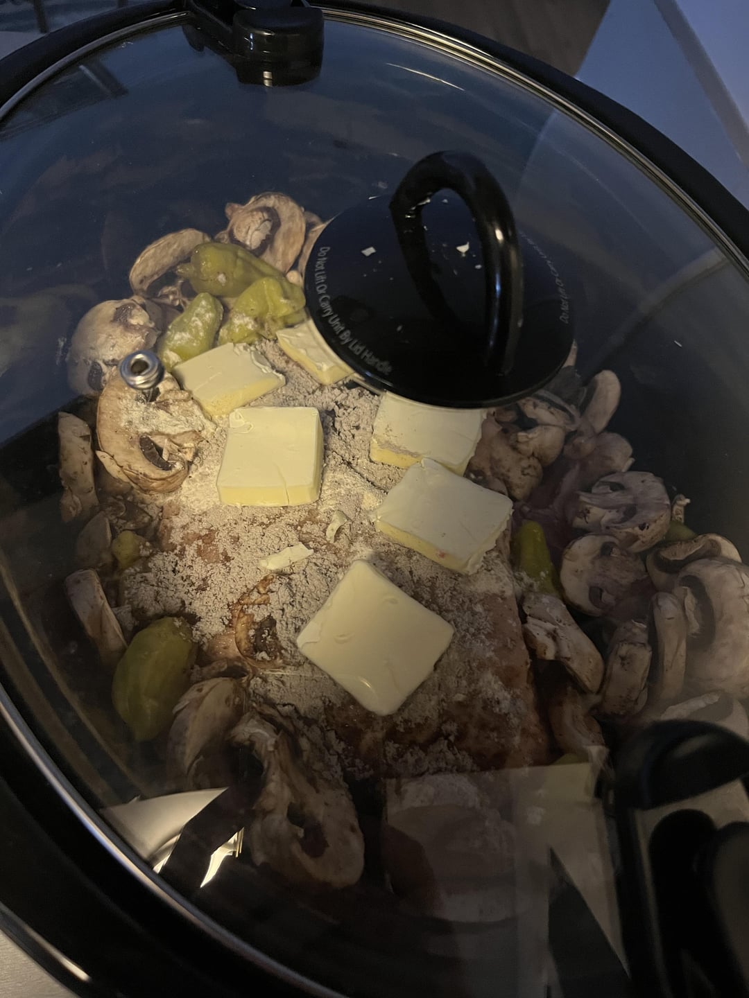 AlwaysSavvy 3 years ago Receipt: https://www.saltandlavender.com/wprm_print/40588I modified the recipe to use 4 lbs of boneless pork shoulder instead of the beef. I also put a lot of mushrooms in, only used a 1/2 stick of butter, and only used a fraction of the ranch/aus jus packets. Came out amazingly.