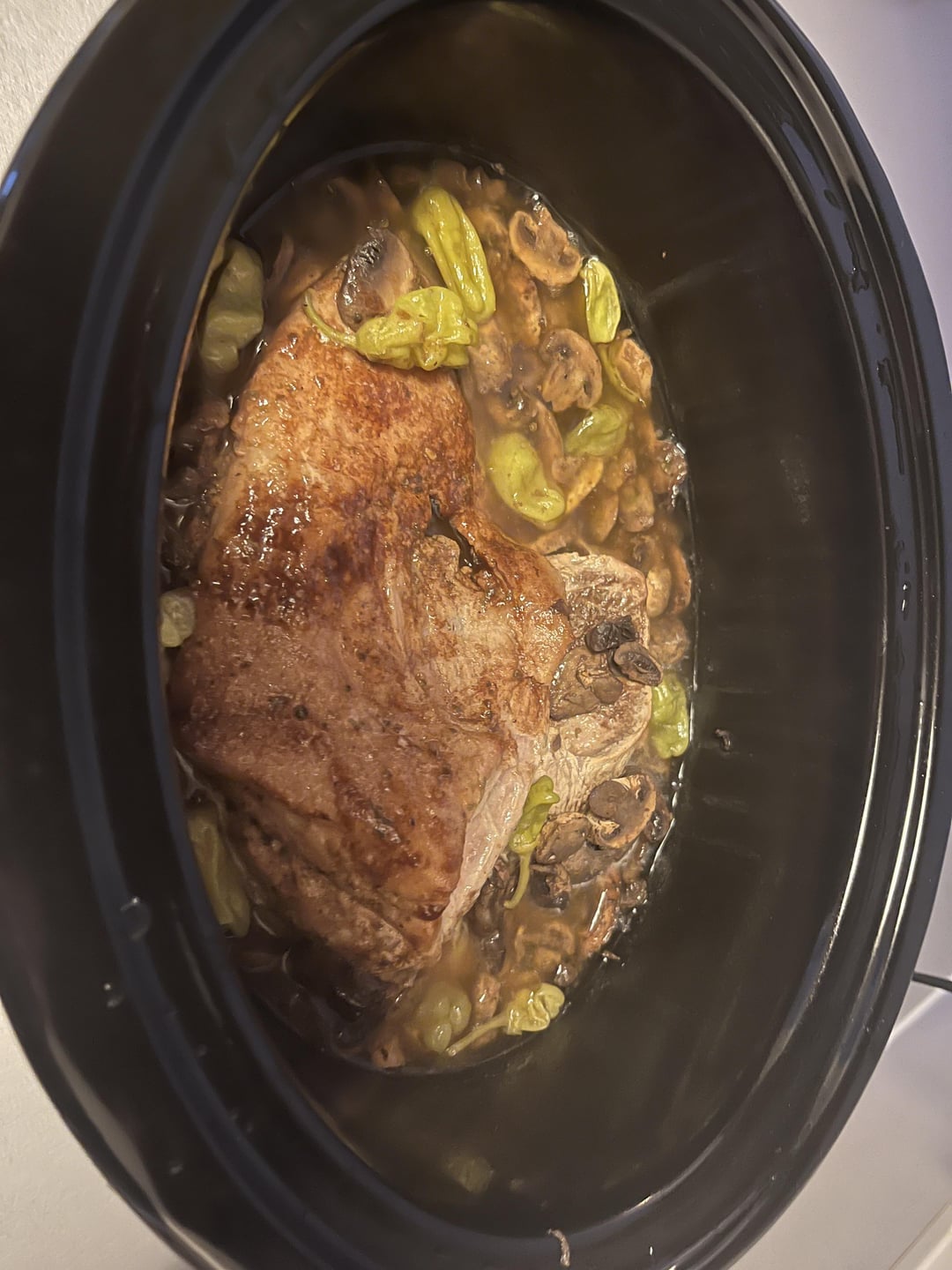 I modified the recipe to use 4 lbs of boneless pork shoulder instead of the beef. I also put a lot of mushrooms in, only used a 1/2 stick of butter, and only used a fraction of the ranch/aus jus packets. Came out amazingly.
