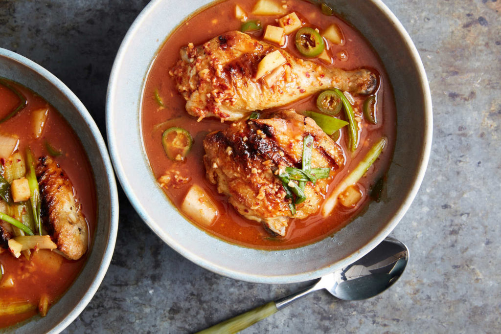 This recipe, from the Brooklyn chef Sohui Kim, is an ideal one-pot weeknight meal, as everything — chicken included — is thrown into the pot. Soy sauce, fiery gochugaru (Korean dried red-pepper flakes), fish sauce and radish kimchi give this stew a deeply funky, satisfying flavor. The kimchi called for here is not cabbage kimchi, it is kkakdugi, sometimes listed as cubed radish kimchi or cubed moo radish kimchi, available at Korean grocery stores.
