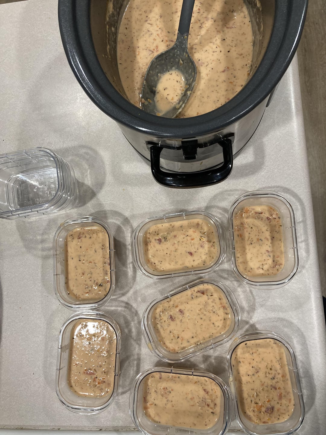 2. 30 minutes before serving. Remove bay leaf. Melt butter over low heat. Whisk flour into butter to create a roux. Whisk 3-4 minutes until golden brown. Whisk 1 cup of the soup into roux until smooth. Whisk in a second cup until smooth.