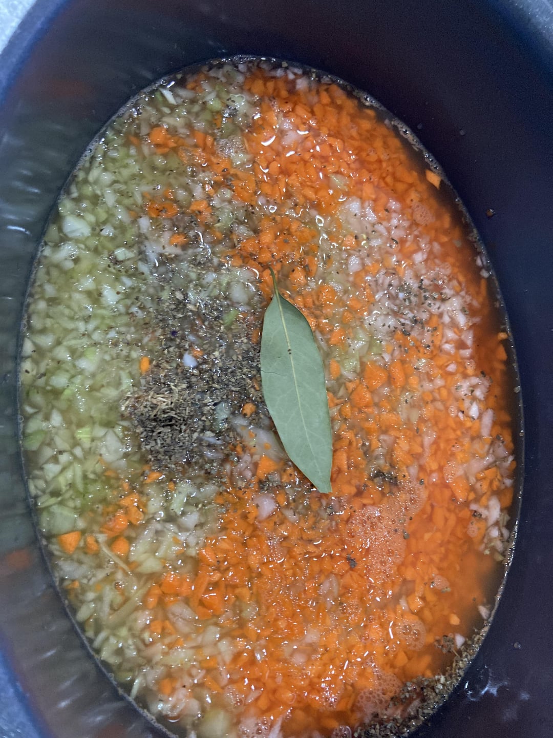1. Add tomatoes, celery, carrots, onions, oregano, basil, chicken broth, and the bay leaf to slow cooker. Stir and cook low 7 hours.