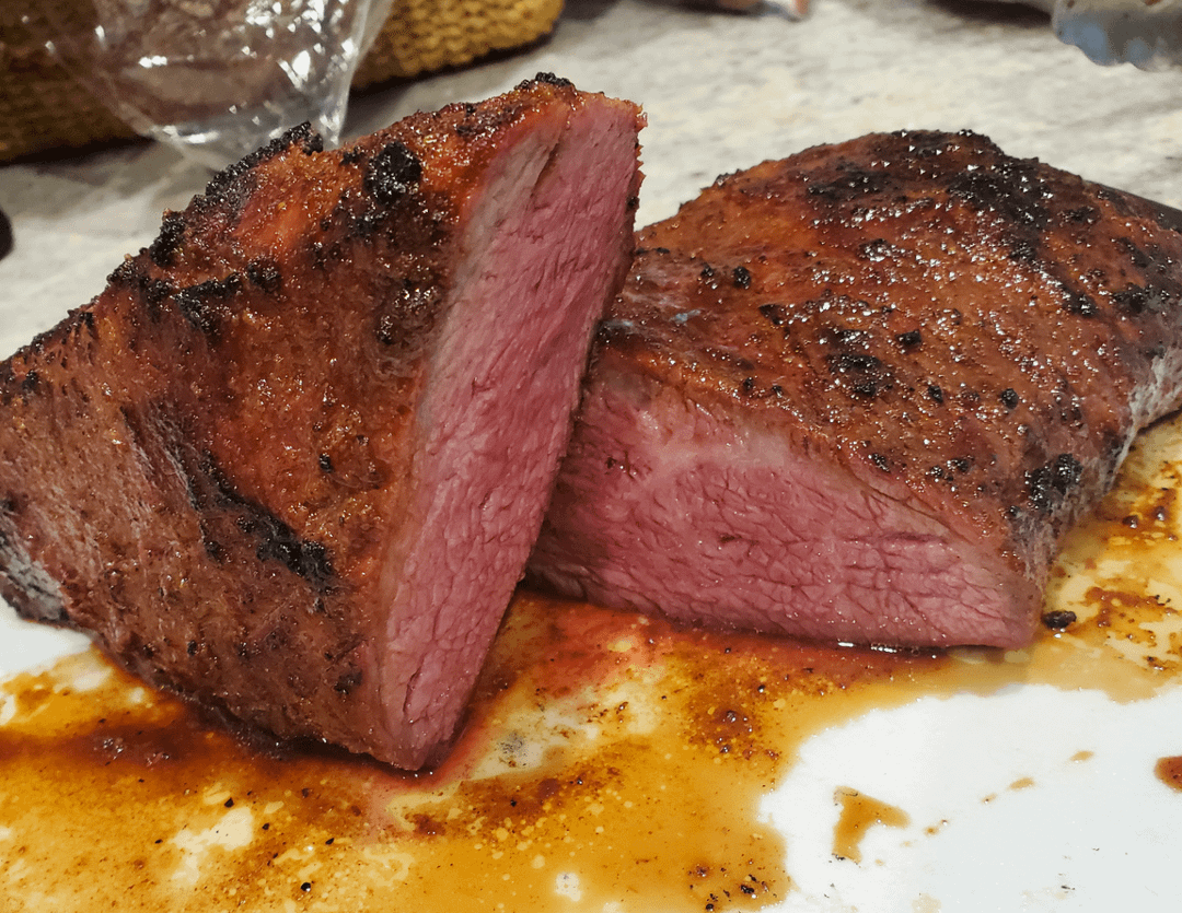 Prime tri-tip, dry rubbed, smoker with apple/mesquite@250F until 125F internal, then finished/crisped on high heat, 10m rest