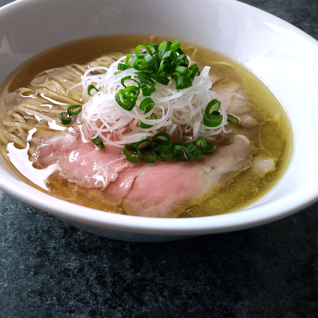 This is a shio (salt-seasoned) ramen with a chicken, oysters, beef, and dashi soup, 35% hydration flat-thin noodles, two slices pork chashu, scallion/leek/onion lard, and scallions as garnish.