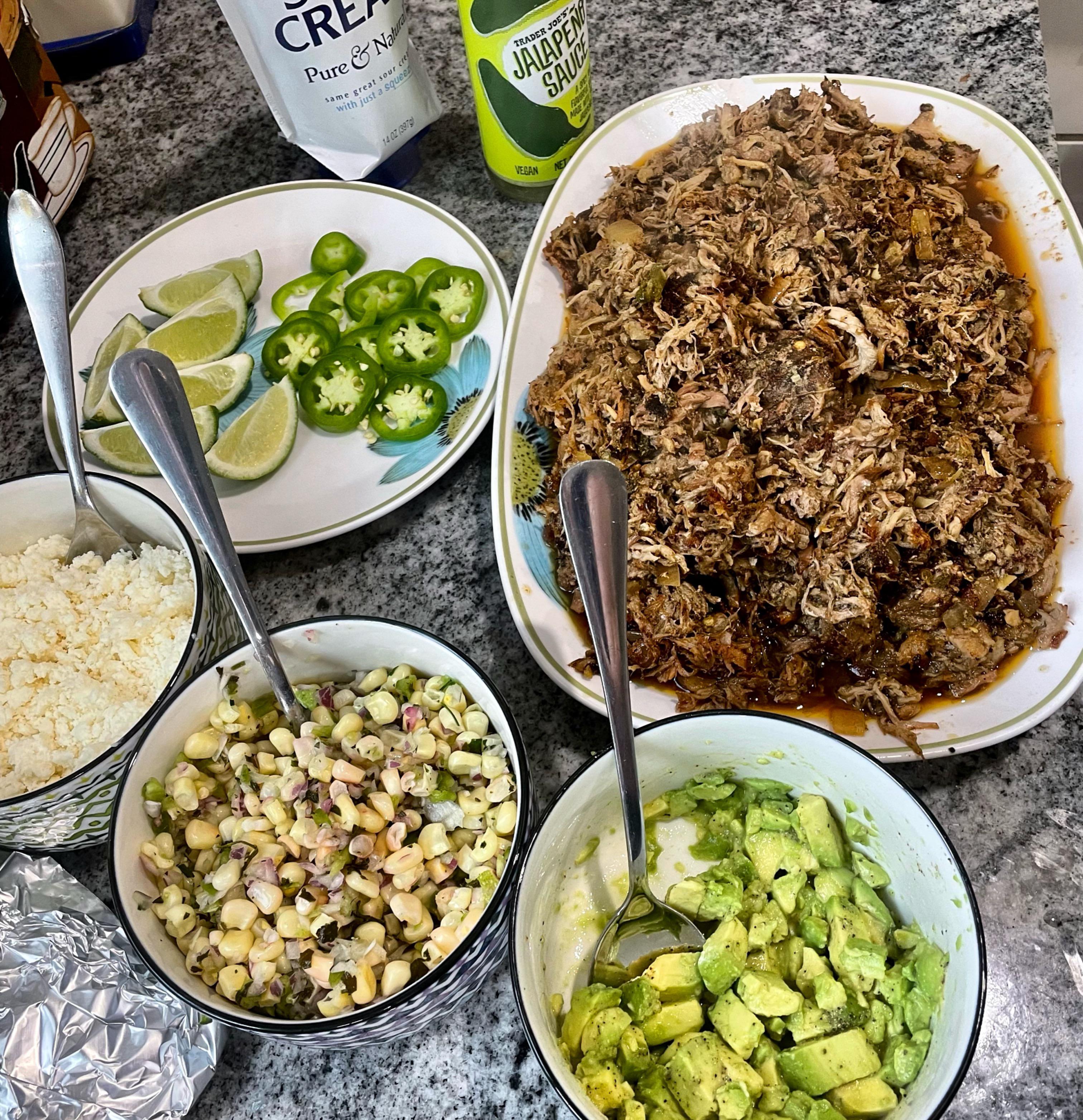 Recipe [here](https://www.recipetineats.com/pork-carnitas-mexican-slow-cooker-pulled-pork/), only change I made was using country style ribs and deglazing the cast iron with remaining juices before pouring over meat. Corn salsa is just corn, red onion, jalapeño, parsley (husband has the “cilantro tastes like soap” gene), lime juice, S&P.