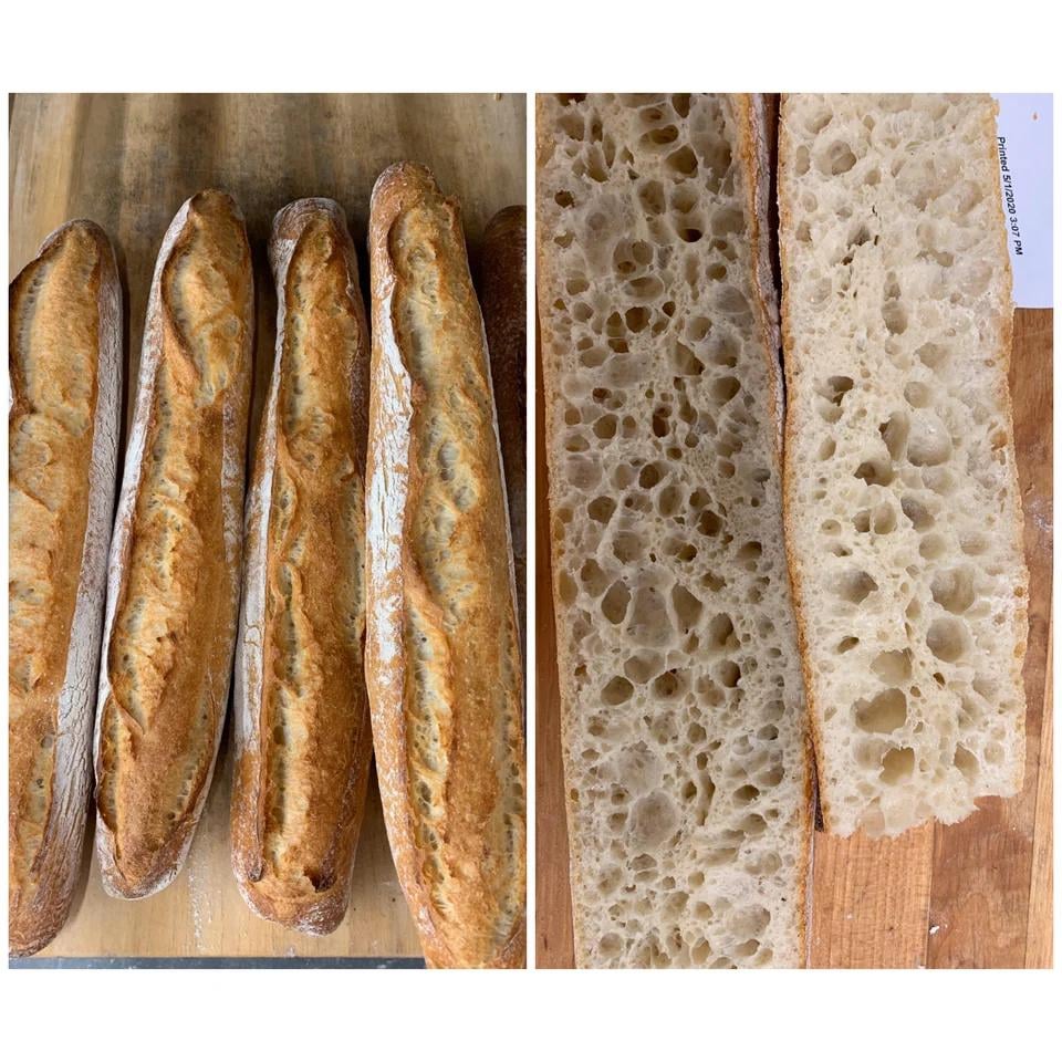 I had posted this in r/food, but didn’t realize this subreddit was a thing. My young six hour levain baguette made simply with flour, water, and salted after a 60 minutes autolyse.