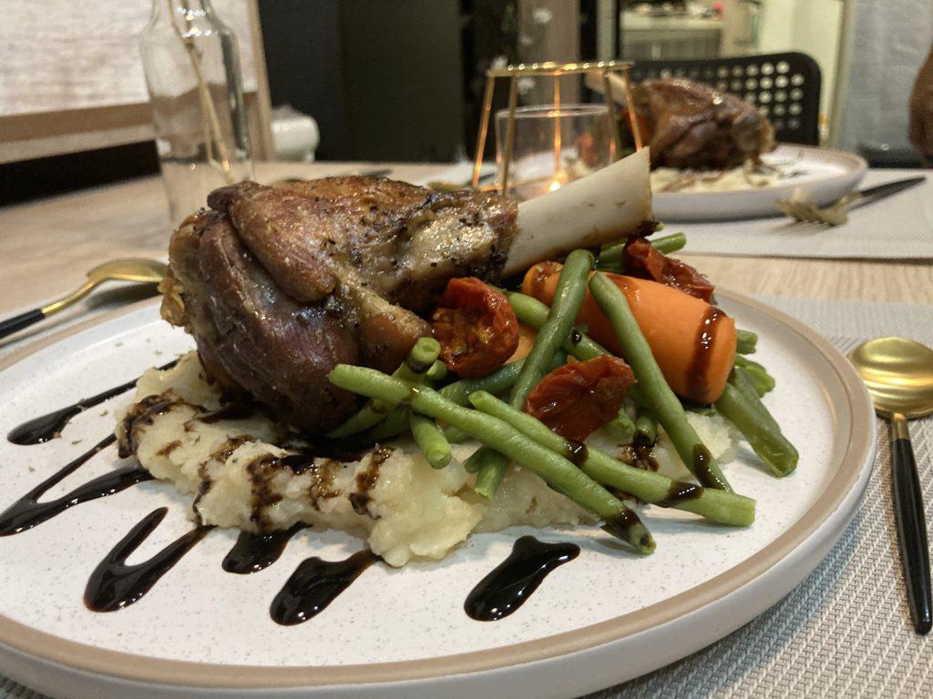 * Lamb shanks: one per serving * Mashed potatoes: about one large Russet per portion, pecorino cheese and butter to taste. * Vegetables of choice: I used frozen fine beans and carrots, about half an lb per person * Soup: I just used a corn soup bouillon and fancied it up a bit * Dessert: Panna cotta is pretty low effort and high reward. I used 1.5g of gelatine powder, a dash of sugar and about 100ml of milk. But substituting some or all of the milk for cream makes for a richer product, and corn starch can work in lieu of gelatine. Some vanilla powder or extract would also be nice, as is fruit for topping.