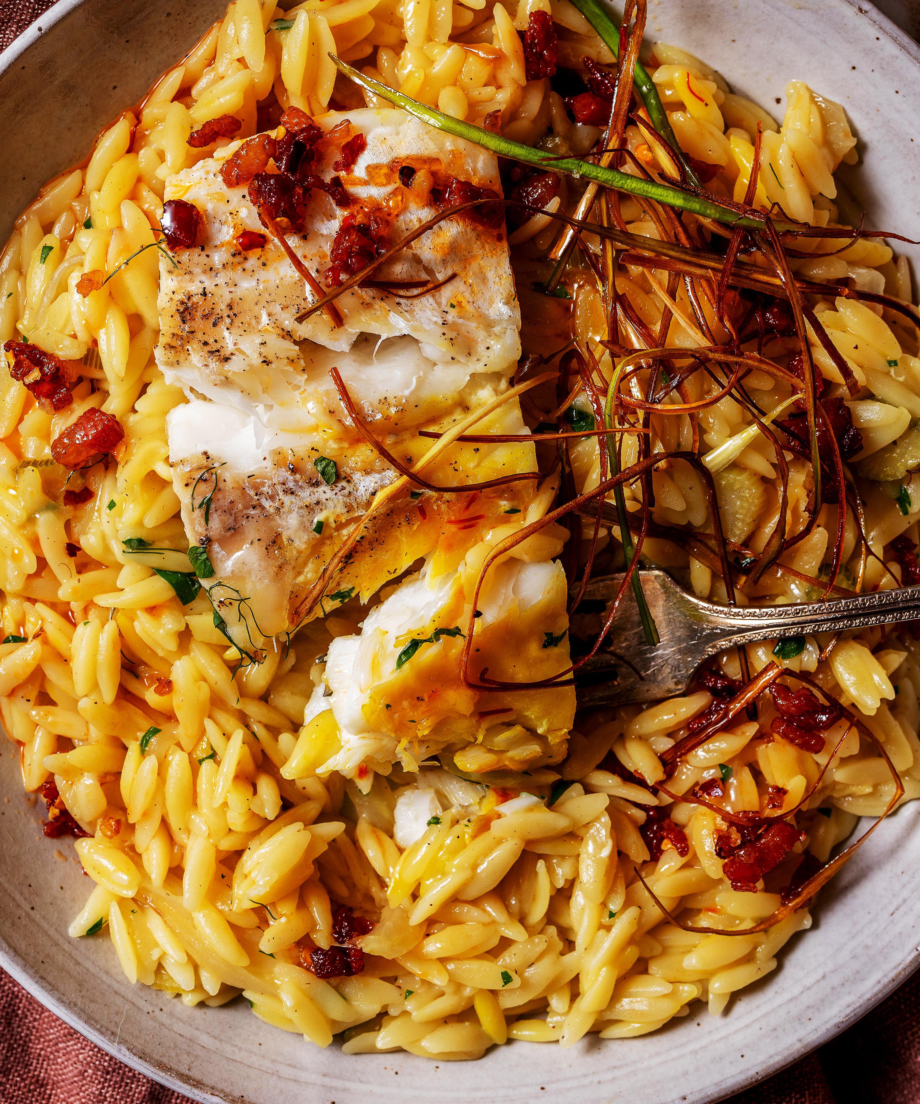 Saffron Cod and Orzo with Guanciale Chili Oil and Frizzled Leeks