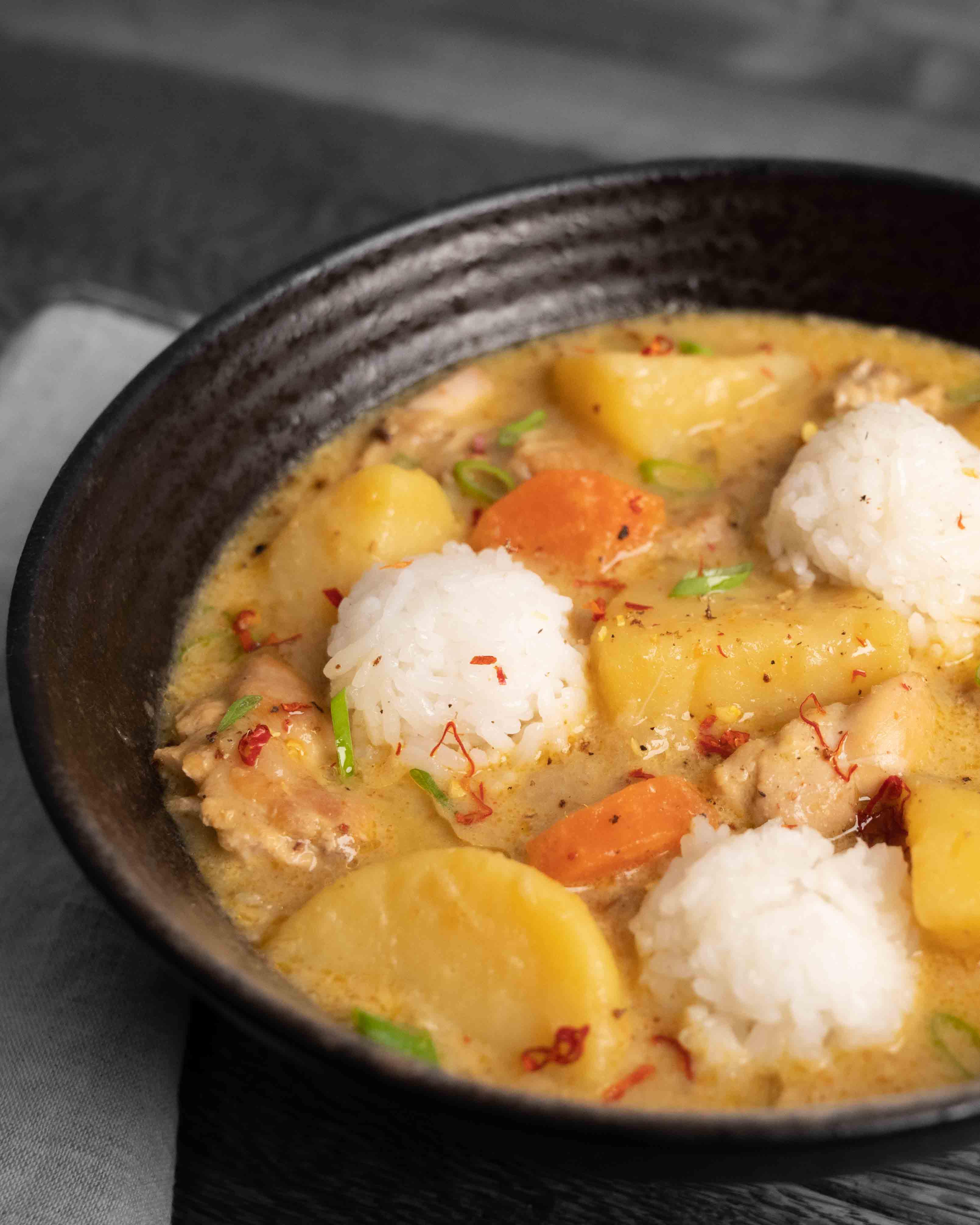 **5.** Add the diced potatoes, chicken broth, and coconut cream to the pan. Return the chicken thighs to the pan. Bring to a boil and then reduce heat to a simmer. Cook for 40 minutes, stirring occasionally. If using chicken breast or tofu, add them once the potatoes are cooked through.