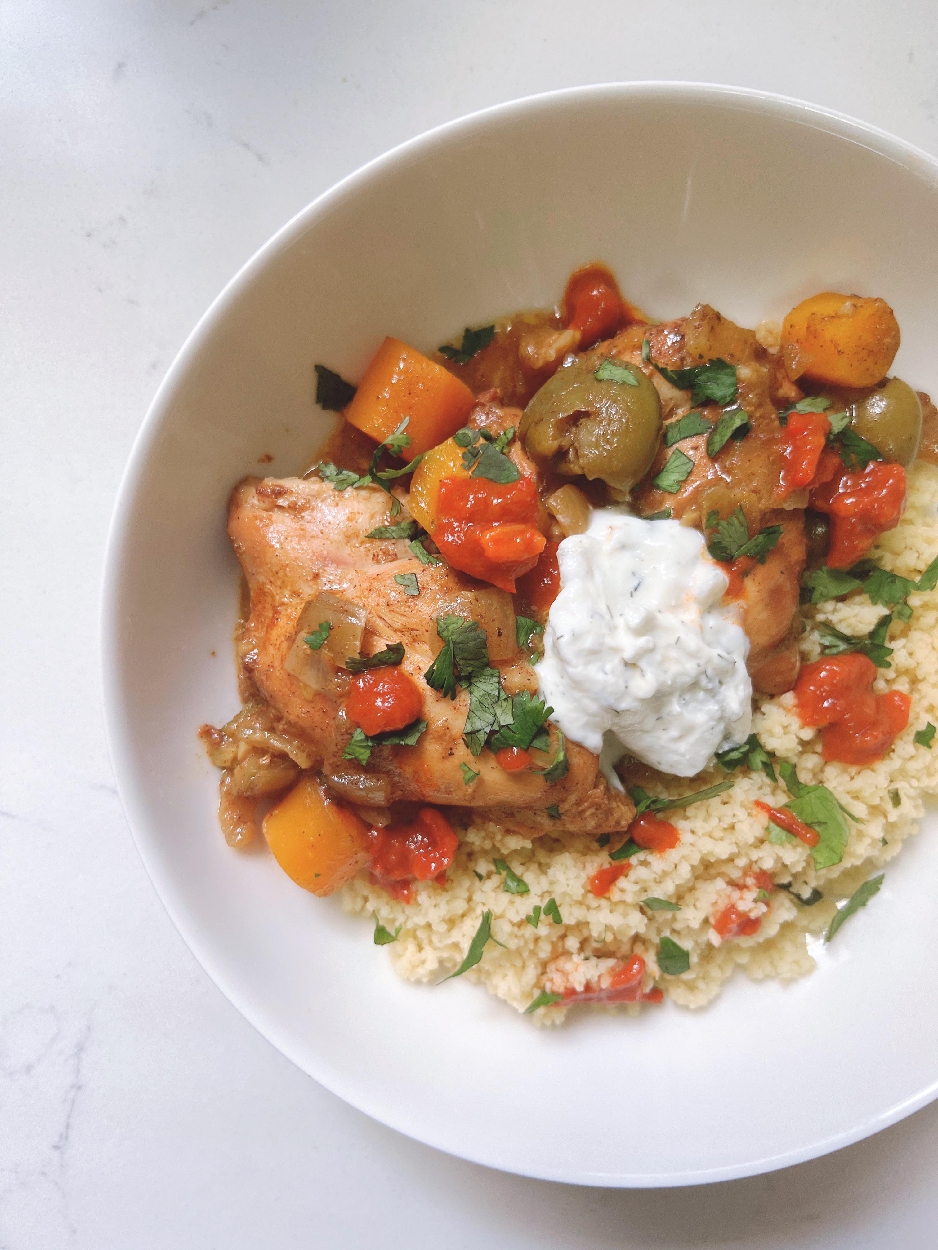 I had leftover couscous from my last meal so I made this [slow cooker Moroccan chicken with olives](https://i.imgur.com/f2TG3ON.mp4). Recipe is by Skinnytaste (because I’m also trying to be ensure I can get off my couch when my ankle heals) and can be found [here](https://www.skinnytaste.com/slow-cooker-moroccan-chicken-olive-tagine/) 🤣