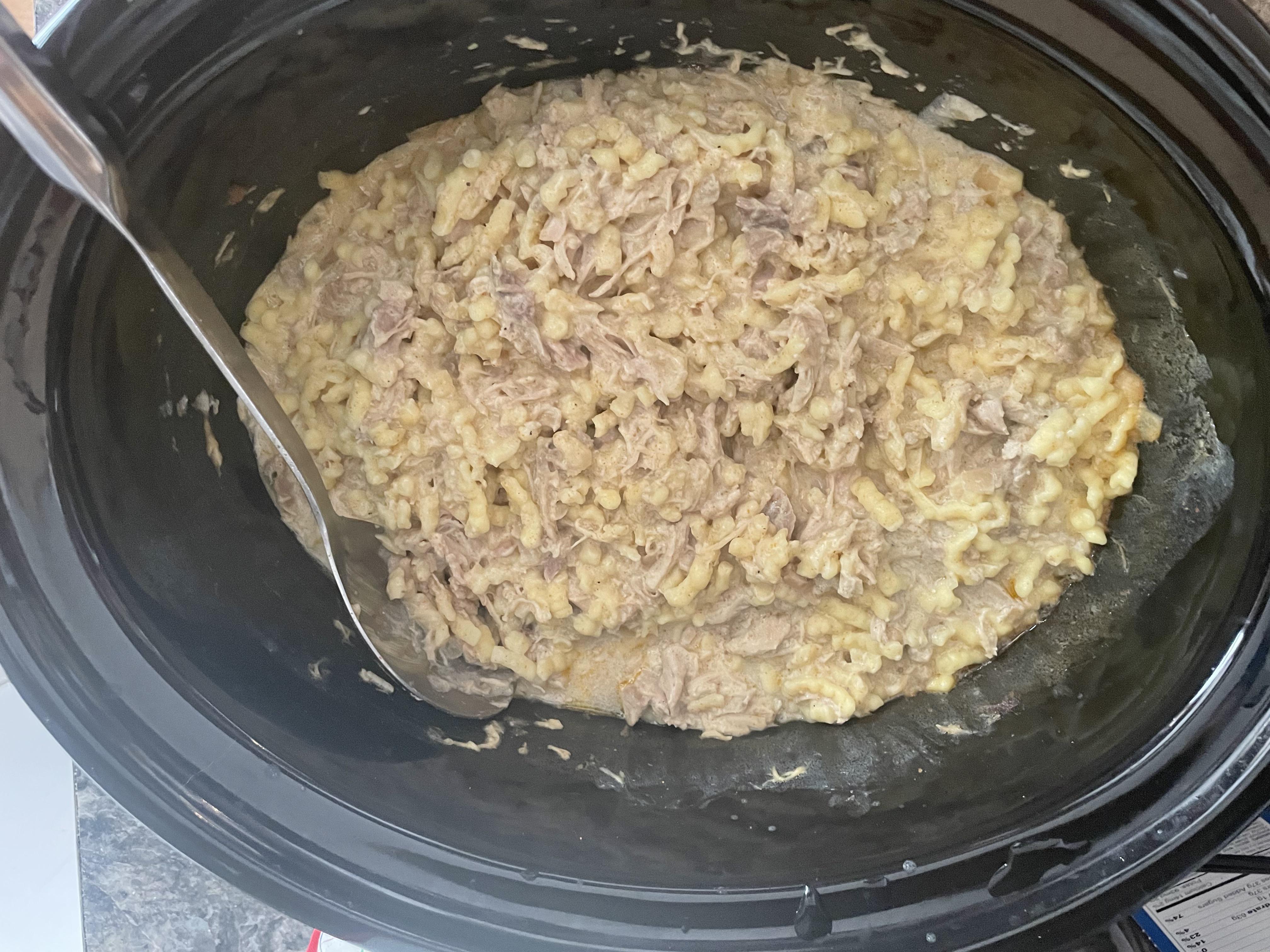 Add the chicken, broth, onion, and paprika to the crock and cook for 4-5 hours on low. Turn the crock to high and shred chicken. Mix the sour cream and corn starch. Start boiling the spaetzle. After 30 min of turning to high stir in the mix of sour cream and corn starch. Switch crock to keep warm and stir in Spaetzle. Salt and pepper to taste.