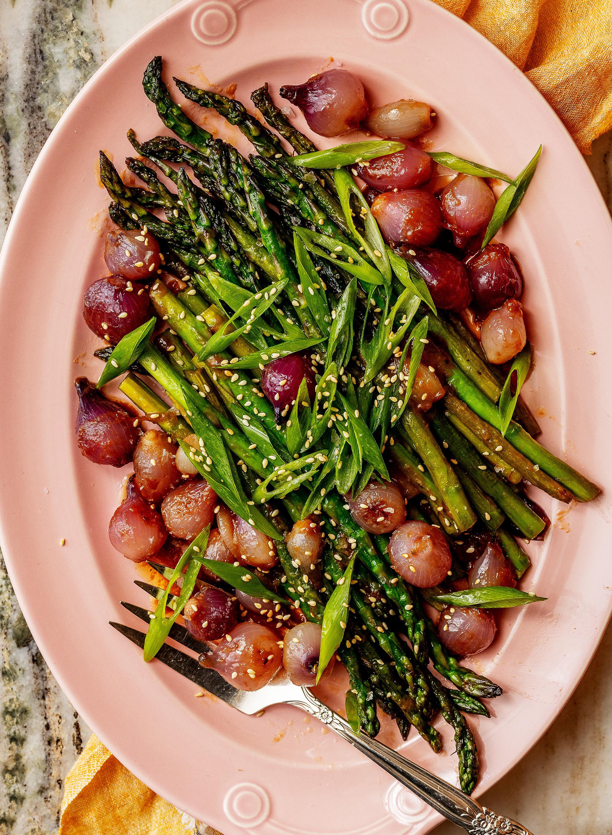 * 8 ounces red pearl onions * 1 tablespoon neutral oil * 2 tablespoons plant-based butter (or use dairy if not vegan) * 2 tablespoons red or white miso paste* * 1 tablespoon brown sugar * 2 teaspoons rice vinegar * 2 teaspoons light soy sauce * 1 teaspoon chili oil * 1 pound asparagus, woody ends removed * Salt to taste * Sliced scallions and sesame seeds, optional, for garnish