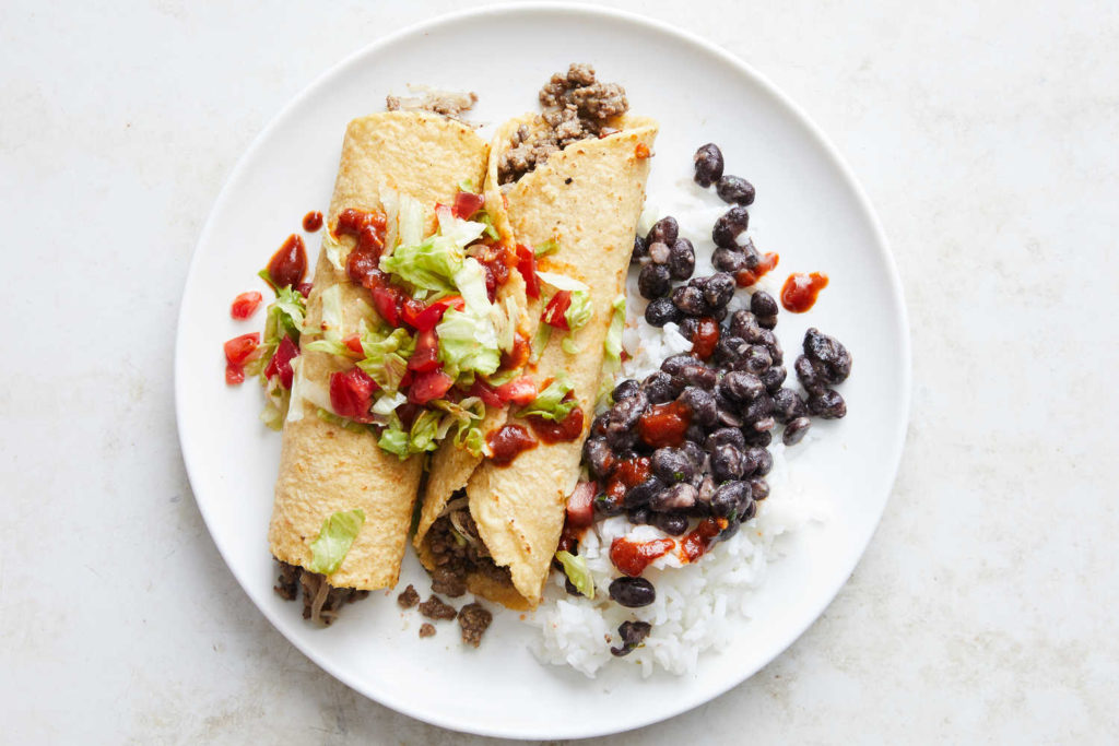 - Sprinkle the tacos with the shredded lettuce and diced tomato. Serve with rice and beans and salsa, if using.