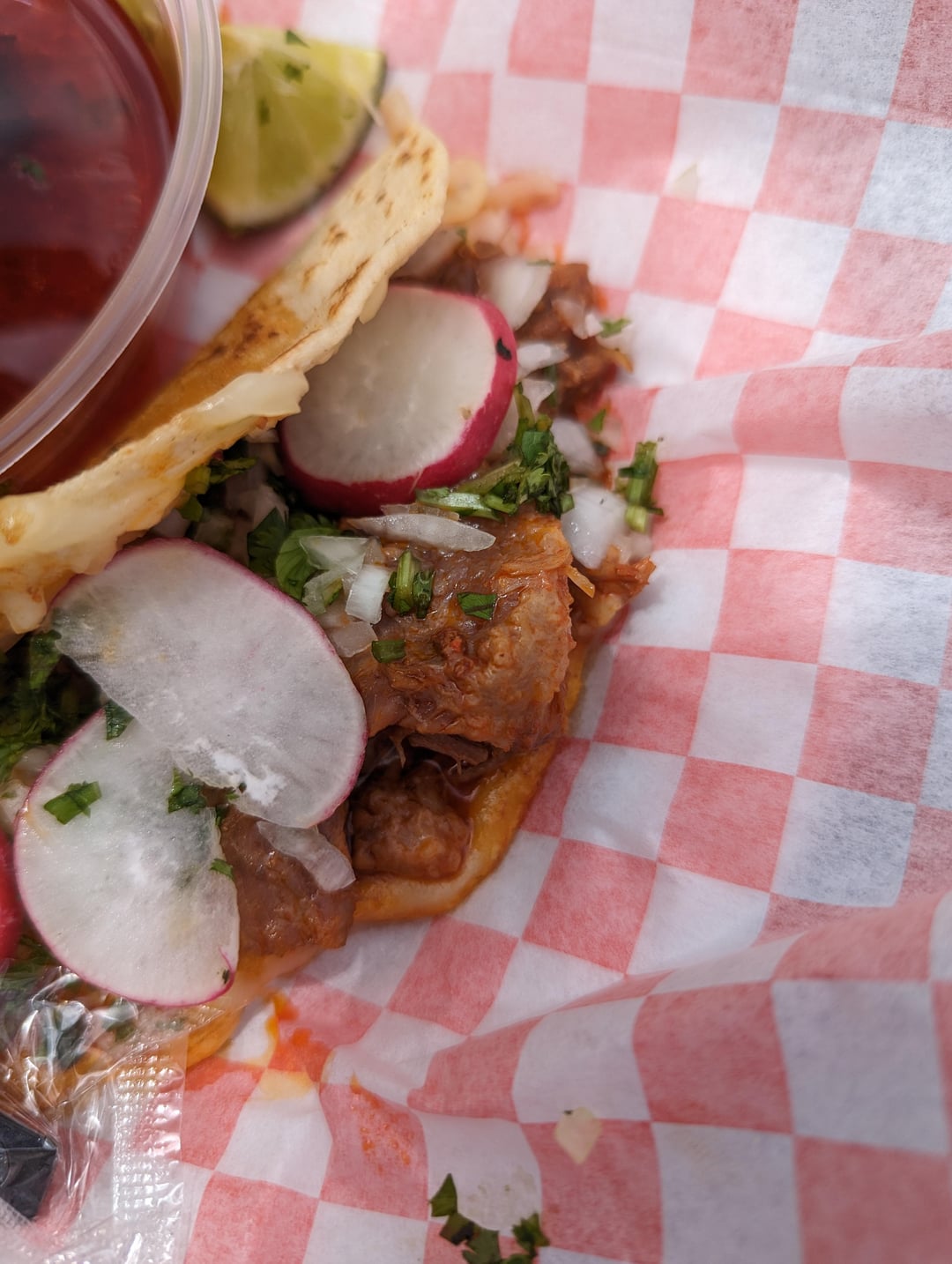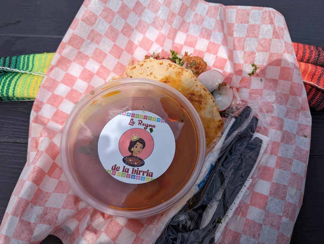 Very tasty, tender quesabirria in a small food truck lot just south of the JD Supermarket. They also have birria ramen, a birria sandwich, quesadilla, etc. Arguably a bit steep at $4.50 for one taco, but cheaper if you get a more. Only open on weekends, I think.