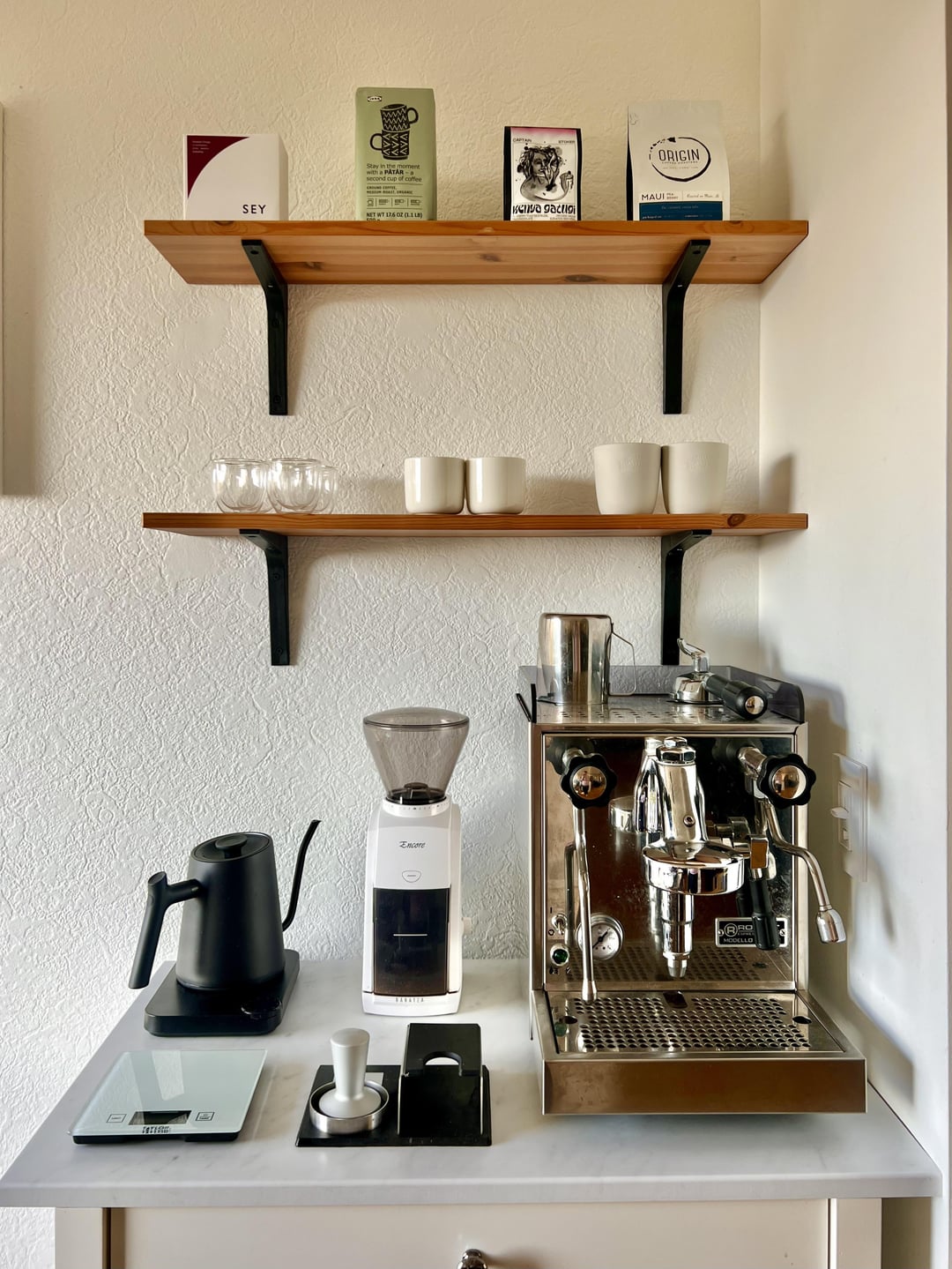 Home is where the coffee is 💭☕️ by pininja2016 11 Comments Sunshineinanchorage 3 years ago It sure is…think I will make a cup now. Nice setup! gauge1156 3 years ago How’s the encore grind for the machine? TraditionalAttorney2 3 years ago Where are the shelves from? Looking for something similar. pininja2016 3 years ago 1. Rocket Classic Espresso 2. Baratza Encore Conical Burr Grinder 3. Miroco Gooseneck Kettle 4. Taylor 3898 Scale 5. Rocket Tamping Station 6. Kalita 185 (not shown) 7. IKEA cabinet modified with a Marble-finish IKEA countertop (cut to fit) 8. IKEA bins 9. Unsure where the shelves came from! superzuhong 3 years ago I’m impressed if you’re able to pull a decent shot off the encore 🫢 bearded_trash_panda 3 years ago Beautiful & efficient use of space! My sprawling countertop setup can be a bit much sometimes zombimuncha 3 years ago The LED on that Linksys WiFi box is far too bright. I also put a sticker on mine to block it. mewmewkitty 3 years ago I like your style. Thanks for the inspo! diyjunkiehq 3 years ago very neat! Horror_Ad5957 3 years ago I love how clean and neat this looks, especially with the overhead shelves and the white bins. Nice! andrew_cherniy96 3 years ago Agreed…Looks dope! Do you mind sharing this with a small interior design [sub](https://www.reddit.com/r/AmateurInteriorDesign/)?Write A CommentYou must be logged in to post a comment.