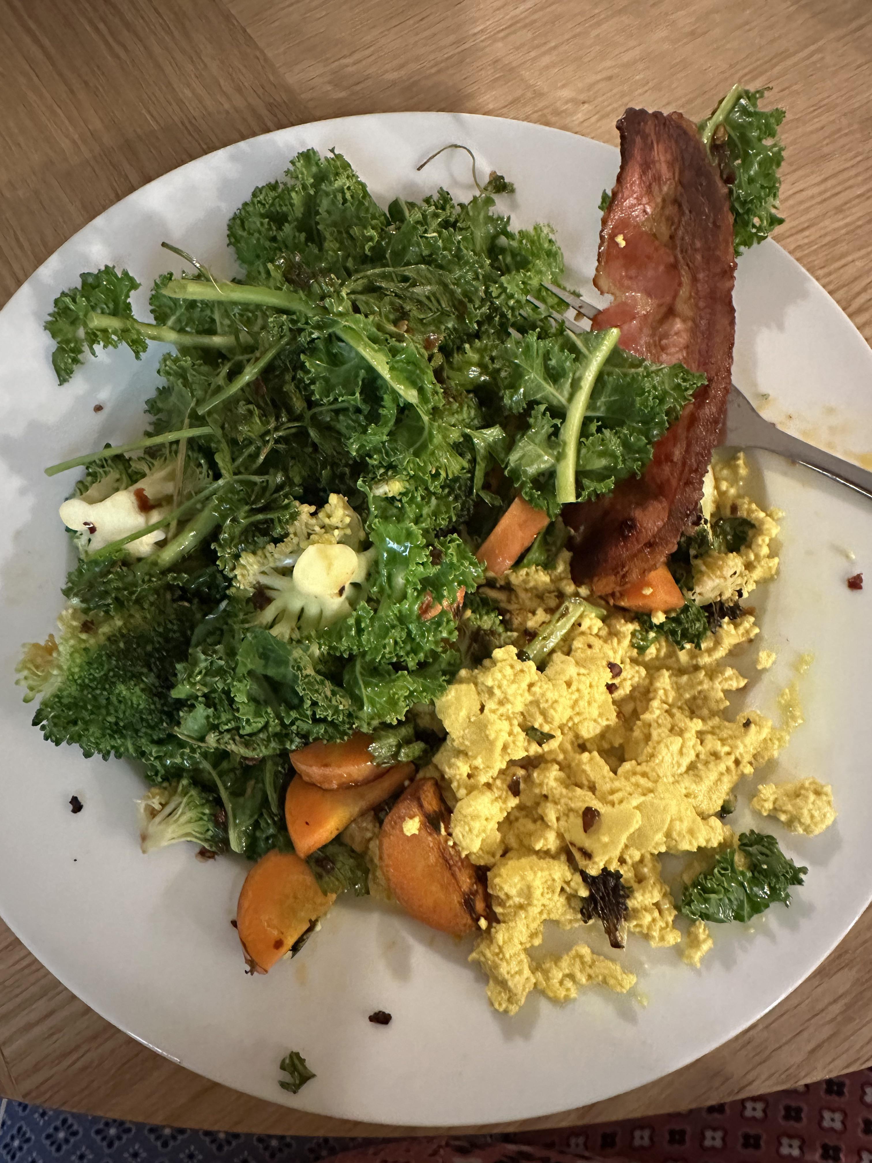 I nearly died from my husband’s suggestion of chilli oil this morning! My mouth is on fire! Pictured with bacon and tofu scramble.