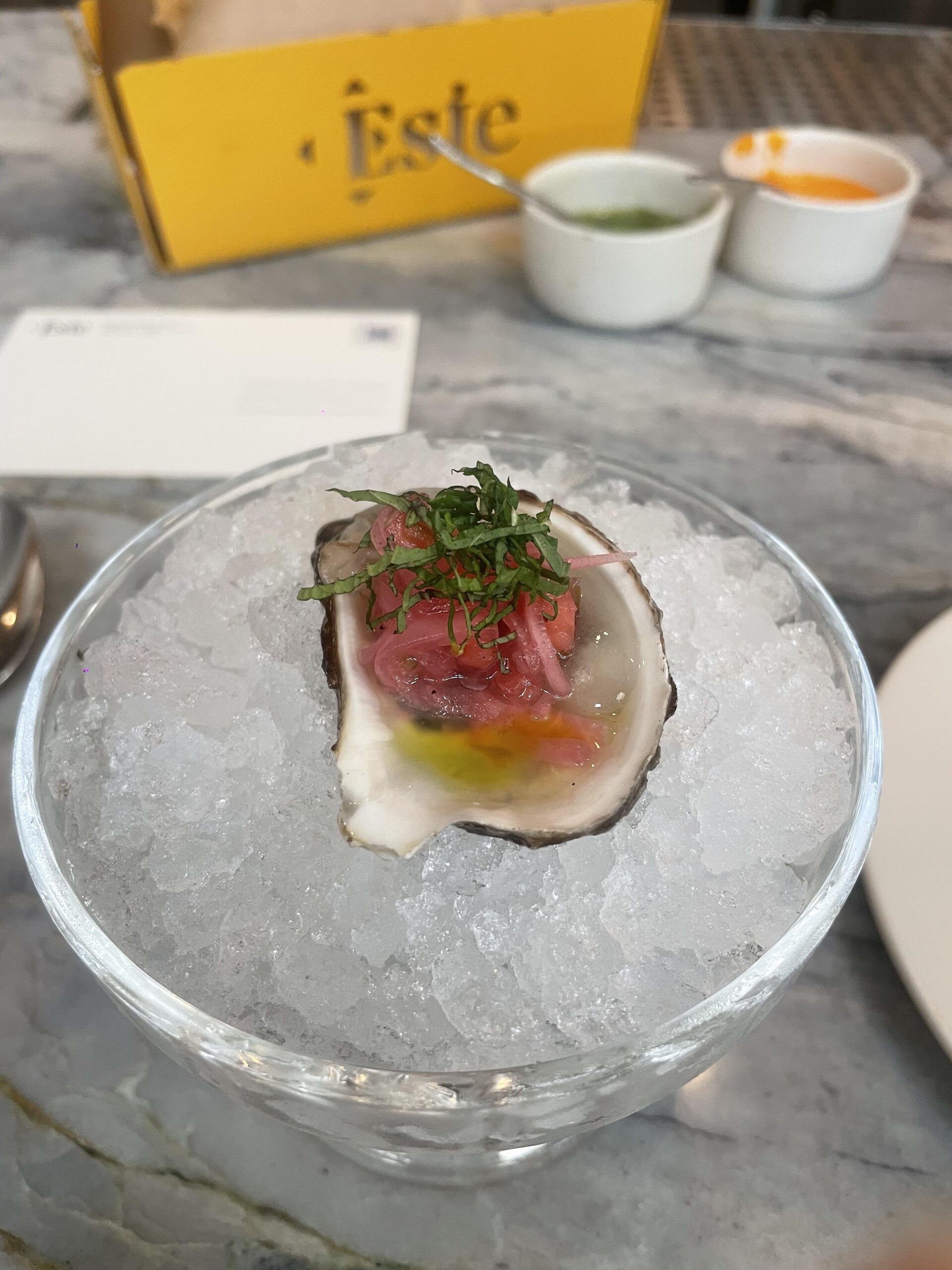 Este – CARIBE OYSTER – ginger-citrus broth, piña y radish slaw, cilantro oil. Incredibly tasty and flavorful, wish they were cheaper than $7 per! Had to try one though, highly recommend!