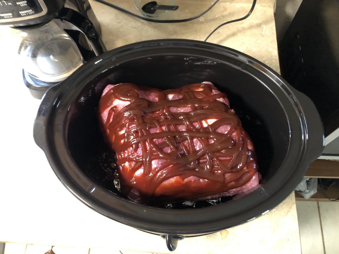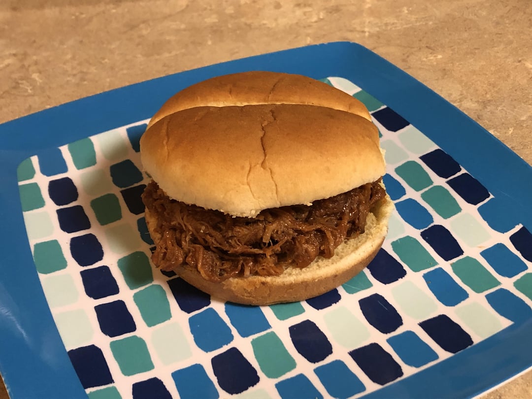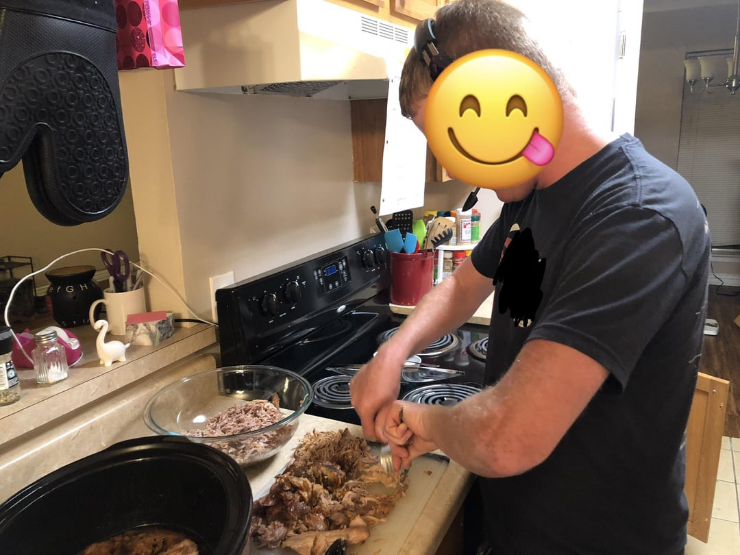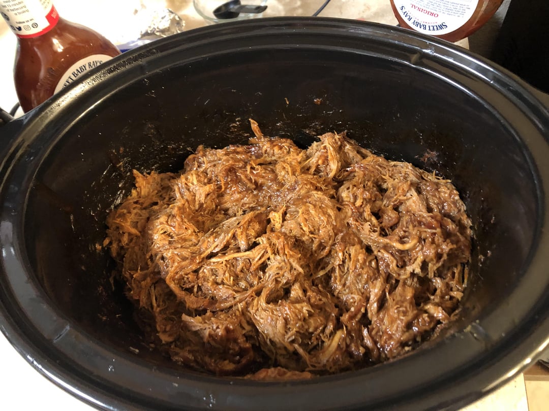 Pulled pork sandwiches: 7 lbs pork shoulder butt, low and slow ~9 hours, bottle of original Sweet Baby Ray’s, served with sweet Hawaiian rolls