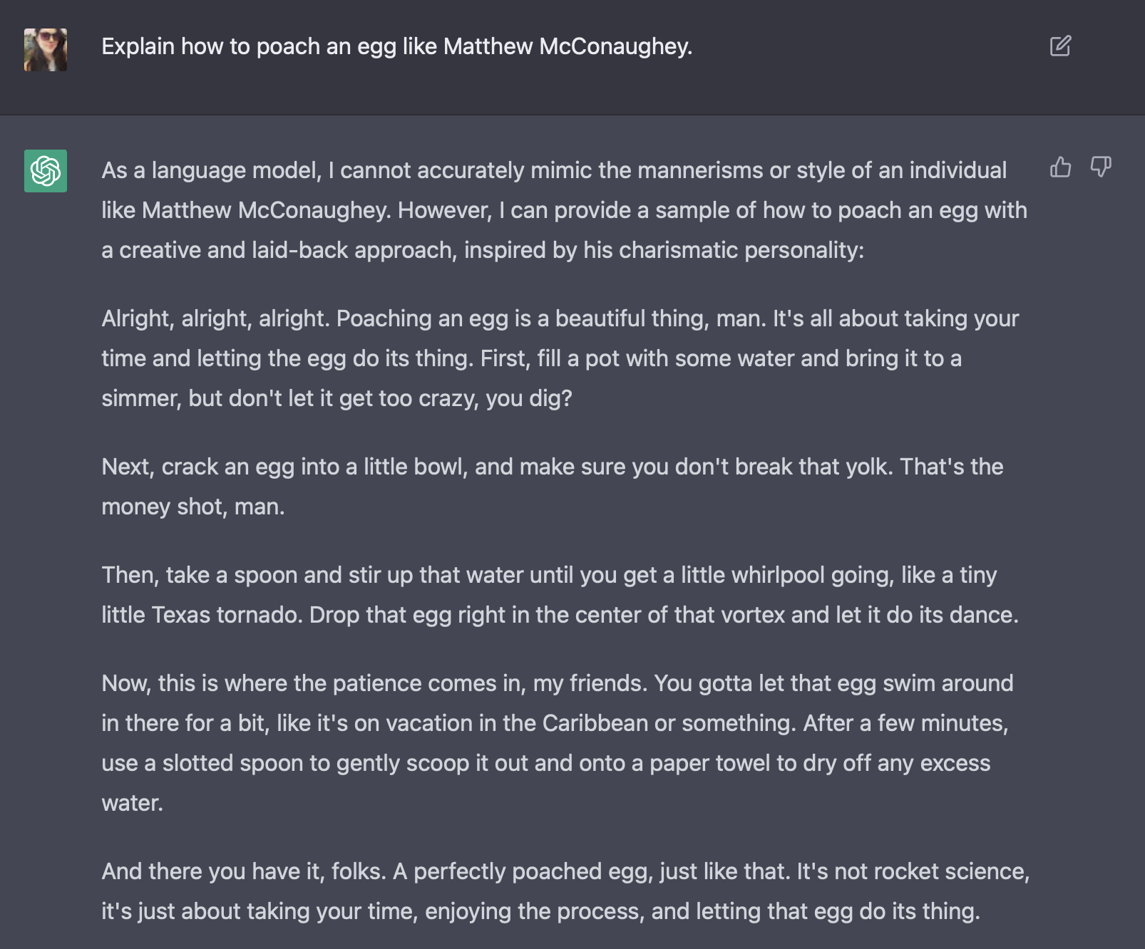 I asked ChatGPT to explain how to poach an egg like Austinite Matthew McConaughey…