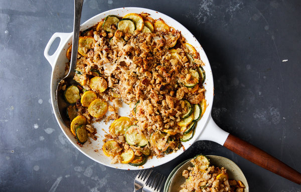 - Add half the squash to the skillet and toss with tongs until combined. Add the rest of the squash and toss again. Add the Gruyère, along with 1/3 of the bread crumbs and toss well. Arrange into one packed layer, sprinkle with the remaining bread crumbs and bake until browned and bubbling, 30 to 35 minutes. Serve hot.