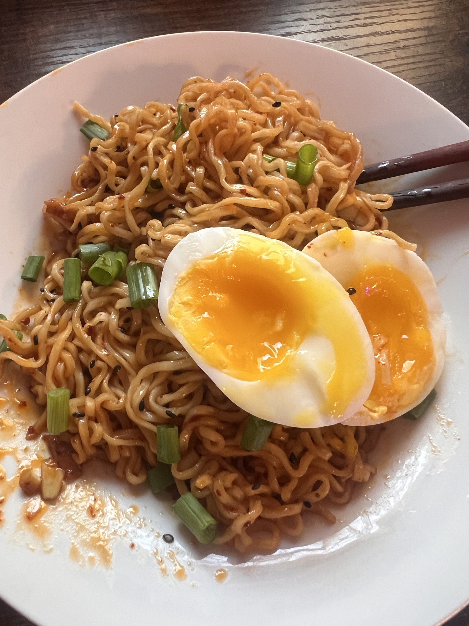 In a pan put about a tbsp of butter on med heat, cook 6-8 cloves of roughly smashed/chopped garlic until nice and tender, throw in some Sichuan oil to taste, korean chili flakes to taste for color mostly, about a tbsp of vegan oyster sauce(or regular or hoisin whatever floats your boat), and a splash of soy sauce. Toss in the noods, top with green onions and sesame seeds(I used black, it’s what I got right now). Soft to medium boil your egg your way, I like the way Chef John from FoodWishes does it.