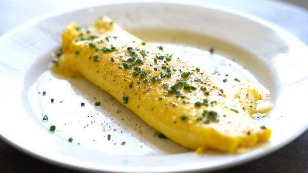 - Using the spatula, roll up the omelet, then flip it seam-side down onto a warm serving plate. Slide the remaining 1/2 tablespoon butter across the top, then sprinkle with a pinch each of salt and pepper and the chives. Serve hot.