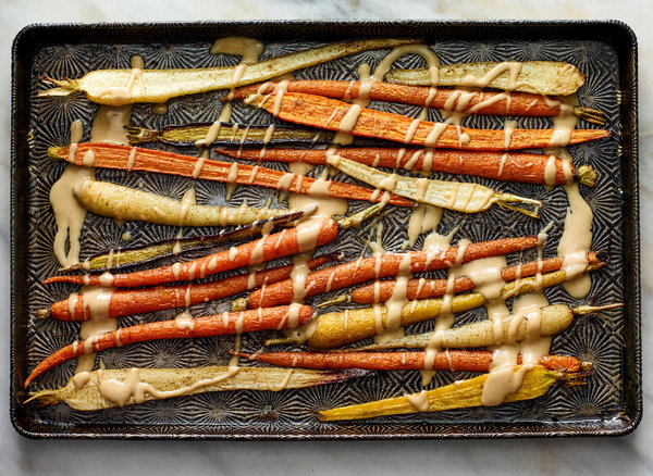 - Transfer the carrots to a platter and drizzle with the tahini glaze, tossing the carrots to coat.