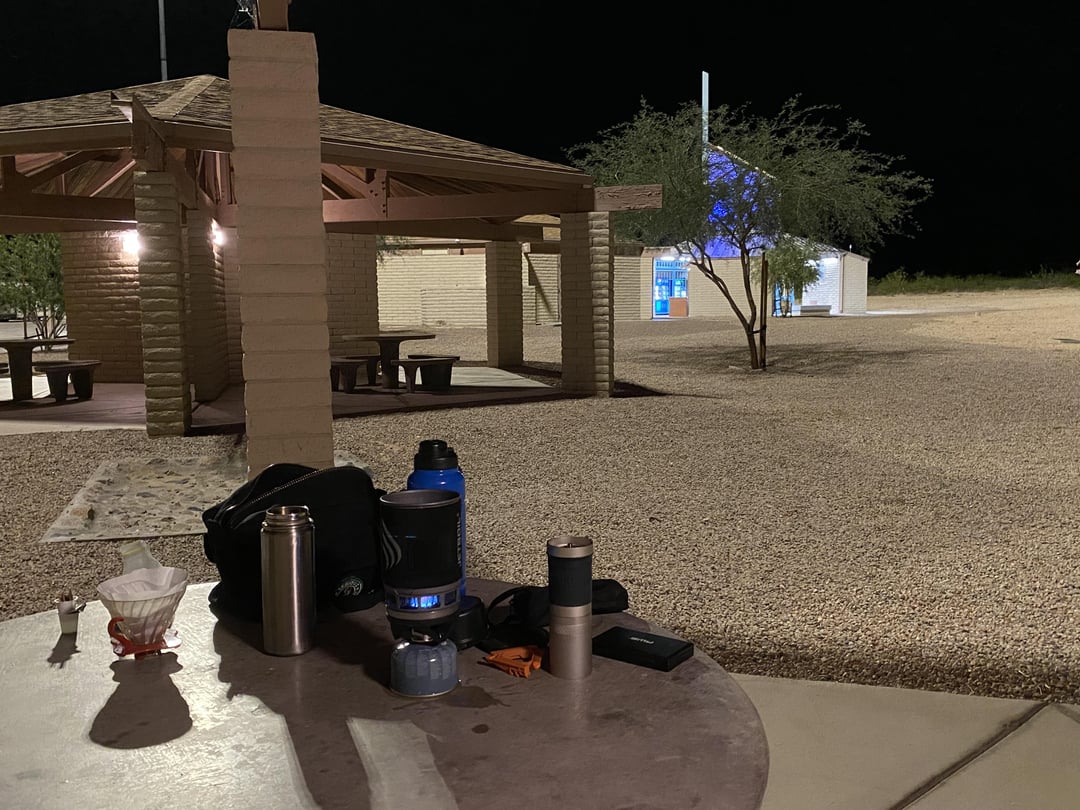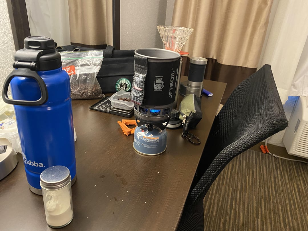 SpecialpOps 3 years ago – Hario V60 and filters – 1Zpresso JX Pro – JetBoil – Peet’s beans – Turbinado sugar – Heavy cream powder – Gram scale – Takaya & Bubba flasks