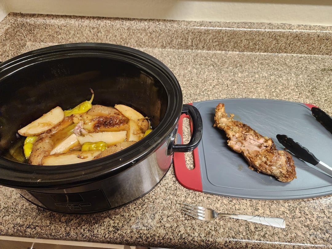Finished product – Mississippi pork loin. Deeeeeeelish and I believe Samwise Gamgee would approve of the taters