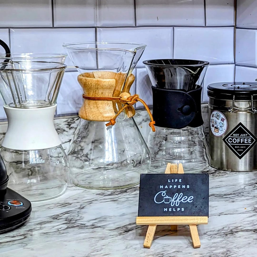 Ninja Coffee bar, Oxo conical Burr grinder, Mecity electric kettle, Kalita Wave Style 185, Chemex, Hario V60 Drip decanter, Airtight coffee container, Bodum Chambord French Press, Bellmain 6 cup Moka Pot.