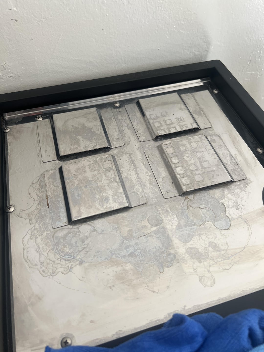 The polished panel above, will be harder to clean as it’s quite visible and mirror polished. I would first clean well with a mild detergent and very hot water, then use a stainless steel appropriate polishing compound to clean and polish as much as possible. Alternatively buying a new cup support tray could be another option.
