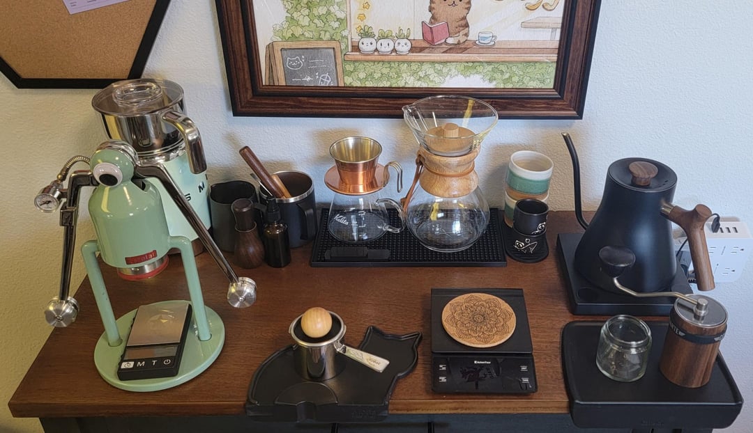 a_halla 3 years ago Top shelf:* A couple febeek vacuum canisters * French press, mostly just for cold brew * 3 cup Chemex that has been retired :’)Table:* SMEG milk frother hiding in the back * Cafelat Robot with a Neoweigh tiny espresso scale and OE leveling rake + tamper * Tsubame Kalita Wave 155 + Kalita 300 mL decanter * 6 cup Chemex * Kitchentour scale * Fellow Stagg EKG * Commandante C40 MK4 with red clix