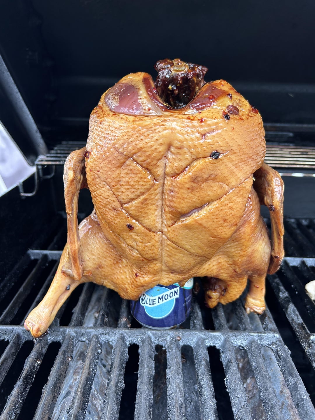 Minus 10 points for not simply spatchcocking or quartering the duck. Beer can style is full of Billy-Bob-Science which doesn’t hold up.