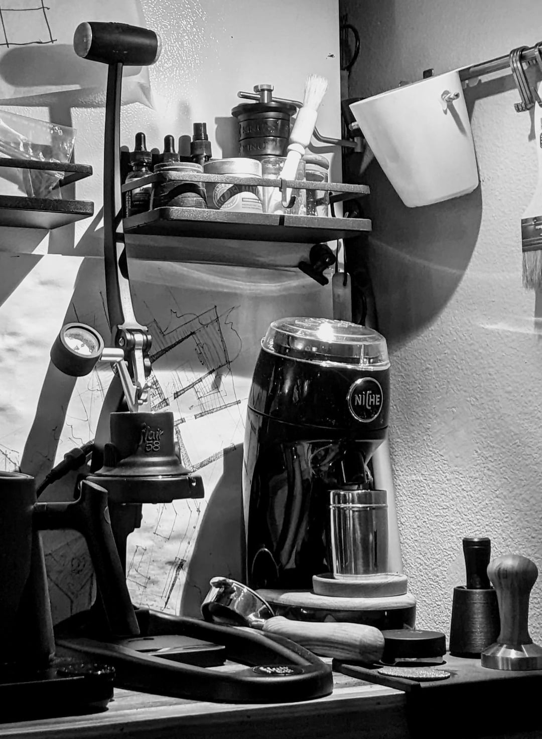 Drinks on the menu today include two shots and two cortados. Just realized I’ve been pulling for two years on the flairs. Ive gotten proficient with this small amount of space. If i bring my setup somewhere else it feels foreign. Hopefully this inspires some other setups. You can for sure do it on a table this small maybe smaller.