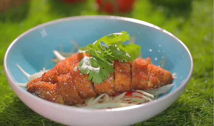 5. Place the fried rolled flour gluten piece onto the green papaya base, then serve.