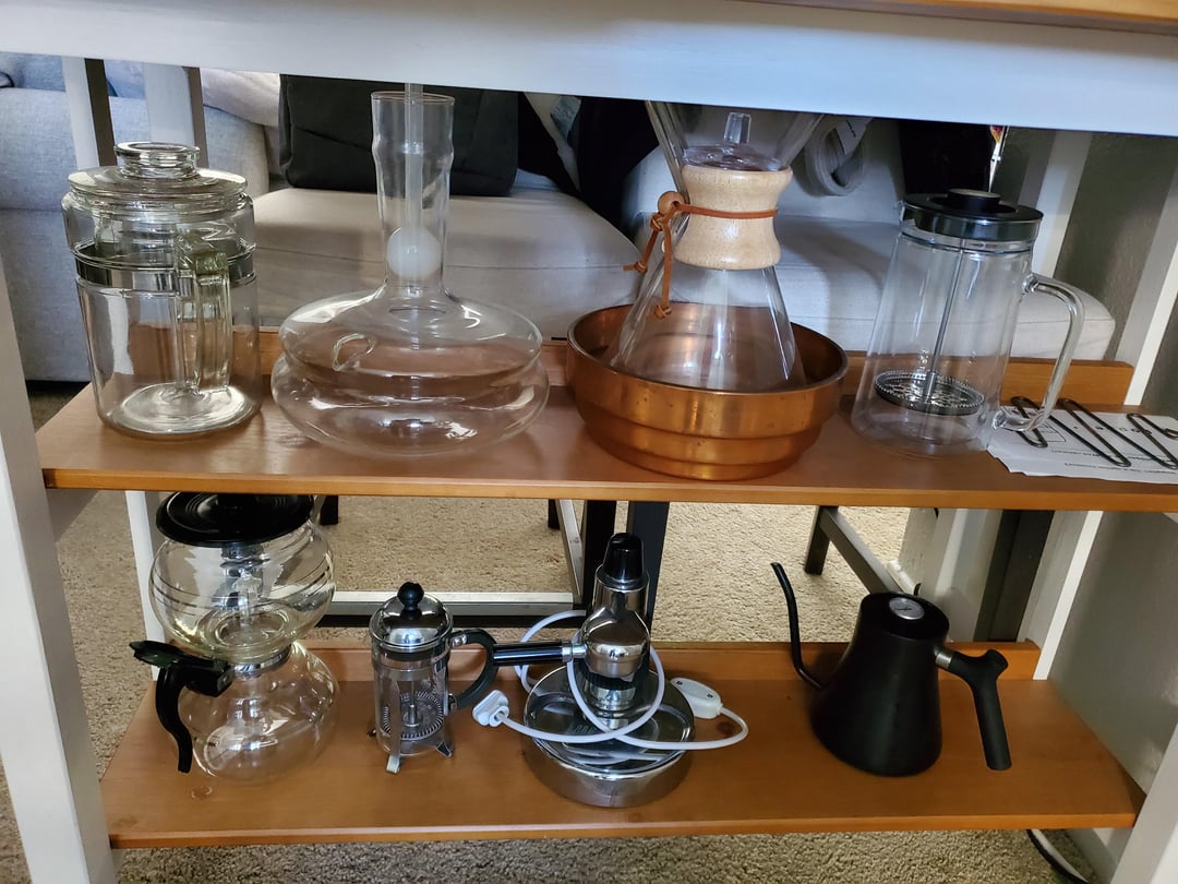 Popper roaster La Pavoni Professional Modded Encore Grinder Pyrex percolator Chemex kettle 13 cup Chemex in Copper Warmer Ikea double walled French Press Corey Glassless Syphon Pot Bodum French Press Utentra Steam Espresso Maker
