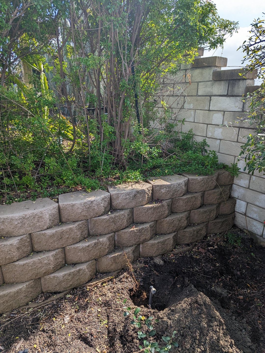 We have a two tier retaining wall with a cape honeysuckle growing along the top tier. Both tiers are roughly 45′ long, the bottom tier is roughly five feet wide and 3′ below the top.
