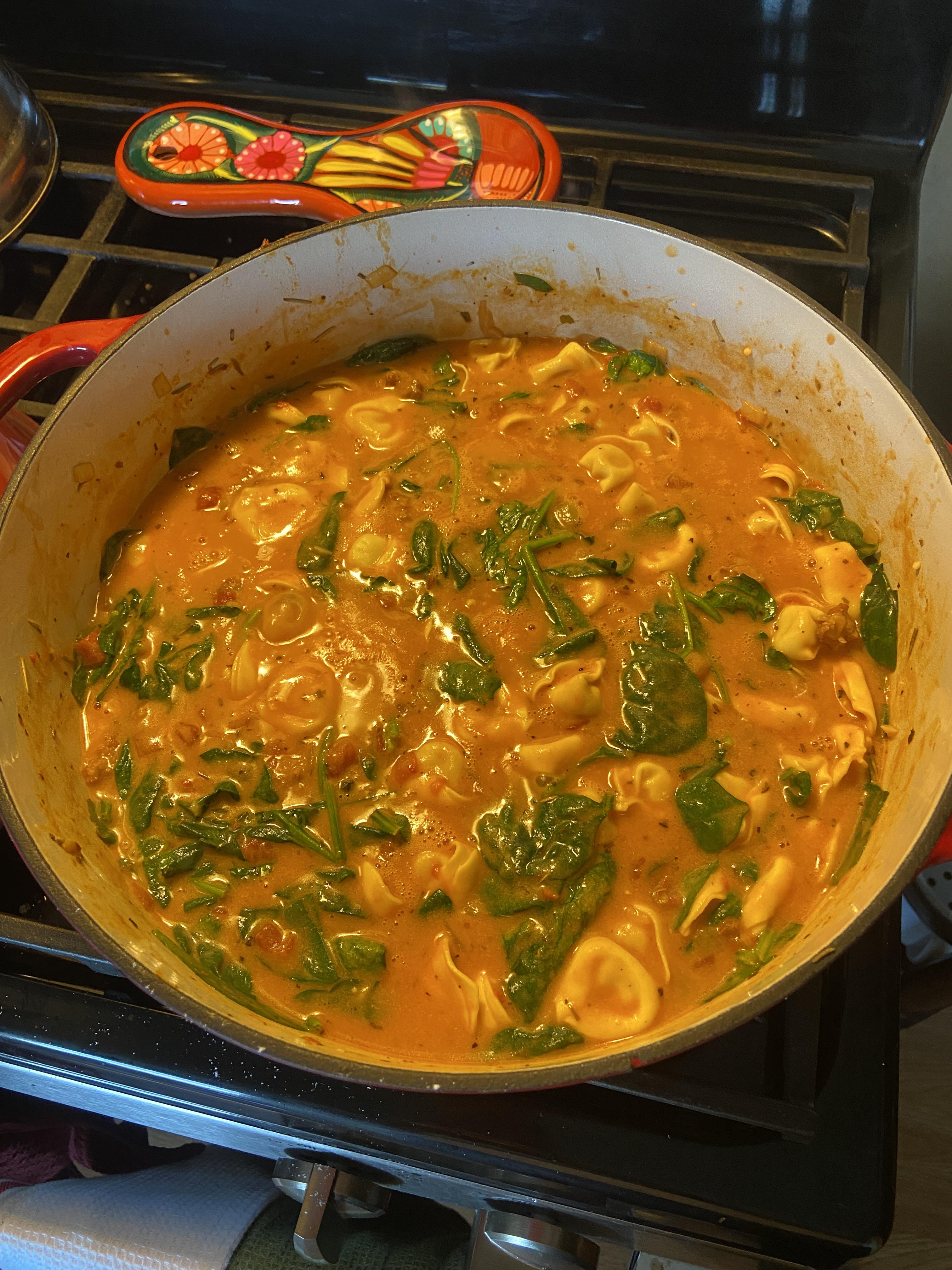 9. Let everything simmer, uncovered, for another 10-15 minutes, or until the tortellini are cooked through and the soup has thickened.