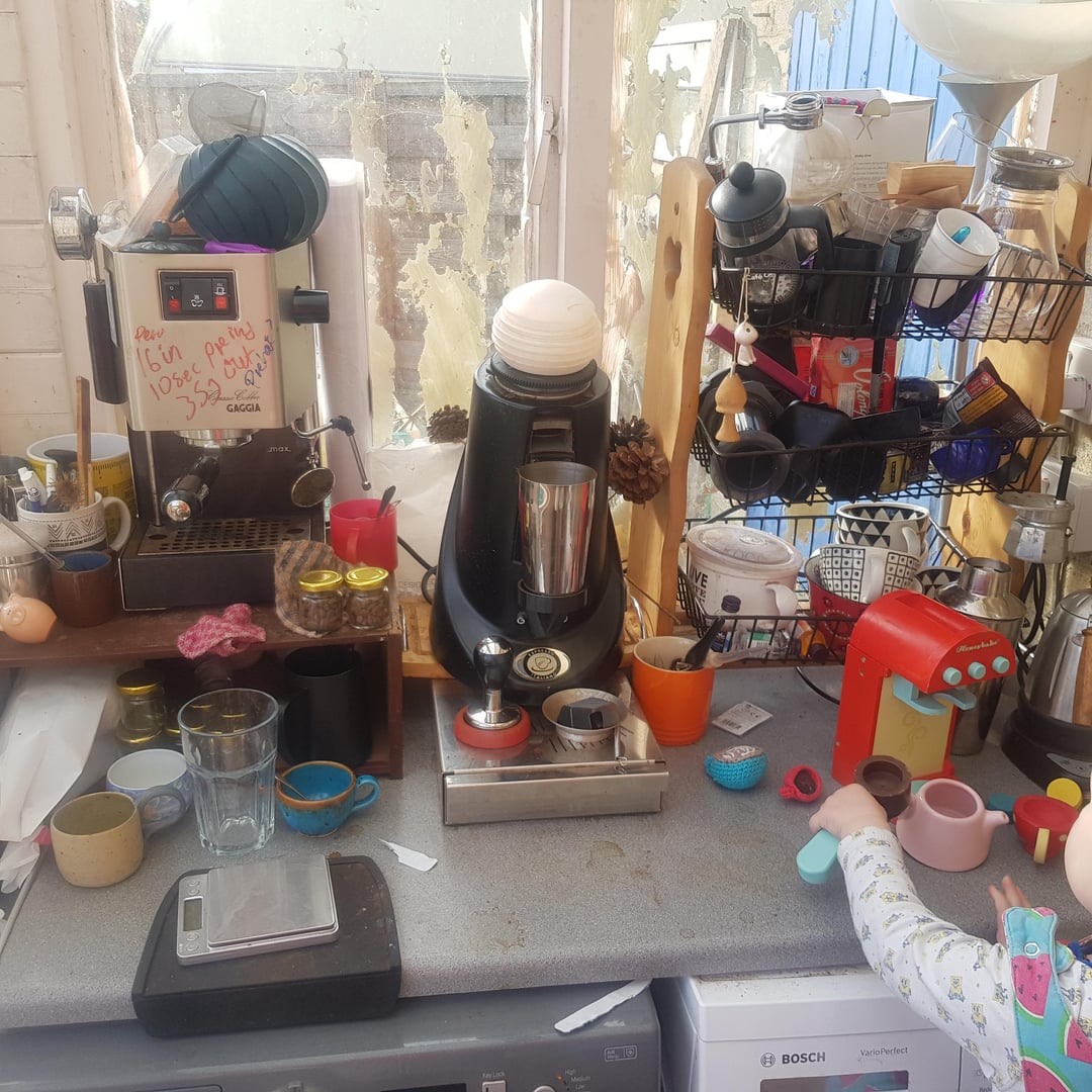 Finally got some shelves to organise my coffee space! (second photo is before) next: rip out the whole shack!by but-first—-coffee 2 Comments but-first----coffee 4 years ago left to rightmany cupsgaggia classicmany cupsbean storage (from hobby craft)hot chocolate gear (including baking essences for flavouring, screw syrups!)second espresso machine (for younger connoseurs)la spaziale astro 8 modded to be a single dosepid kettlebeansaeropresssyphoncafetierchemexnot quite pictured is a cold brewer joedurette 4 years ago Your daughter espresso machine is adorable.Write A CommentYou must be logged in to post a comment.
