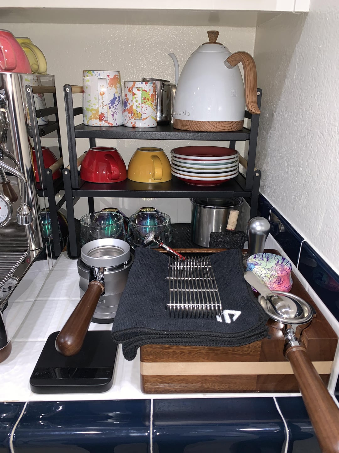 Newly added the shelf to my coffee station by fpw138 1 Comment fpw138 4 years ago Lelit Bianca V2Eureka Mignon Specialita GrinderEureka Mignon Single-Dose Hopper and Silicone BellowsAcaia Lunar Scale in BlackWooden Espresso Knock Box Tamp StationTough Coffee – Portafilter holder standBarista Space milk pitchersFellow Eddy Steaming PitcherAirscape coffee storage canisterBrewista electric gooseneck kettleEspresso thermometerAsso Coffee Jack LevelerCafelat Flat Tamping MatLoveramics Egg style cup & saucerKruve Propel espresso glassesKruve Imagine Milk glassesRSVP stanless steel coffee scoopDIY WDT toolWrite A CommentYou must be logged in to post a comment.