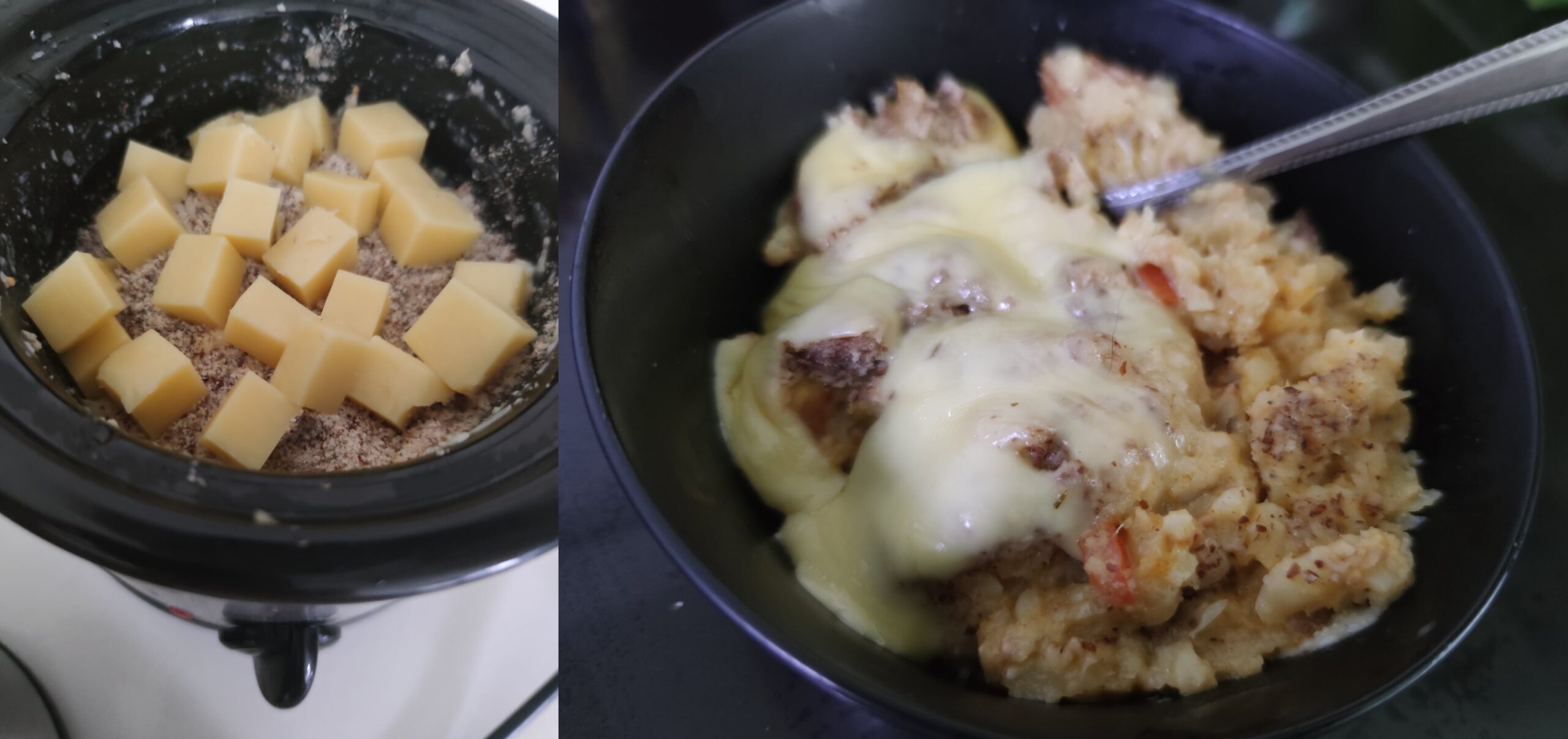 First in was 5 hash browns (about 250g) with no precooking, using a spatula tip to have a dig in and a break up. This helped with adding 3 cloves of crushed garlic next. Along with 3 tbs of cajun spice, 2 tbs of mustard seeds and 5 tbs of hollandaise sauce. Diced a small tomato into the mix whilst I grilled 3 crumbed fish fillets, that then were chopped up and all was stirred through with half a cup of milk (milk powder 3 heaped tbs). Normally I’d use tuna, salmon, hoki or snapper but this time around tried some Alaska pollock.